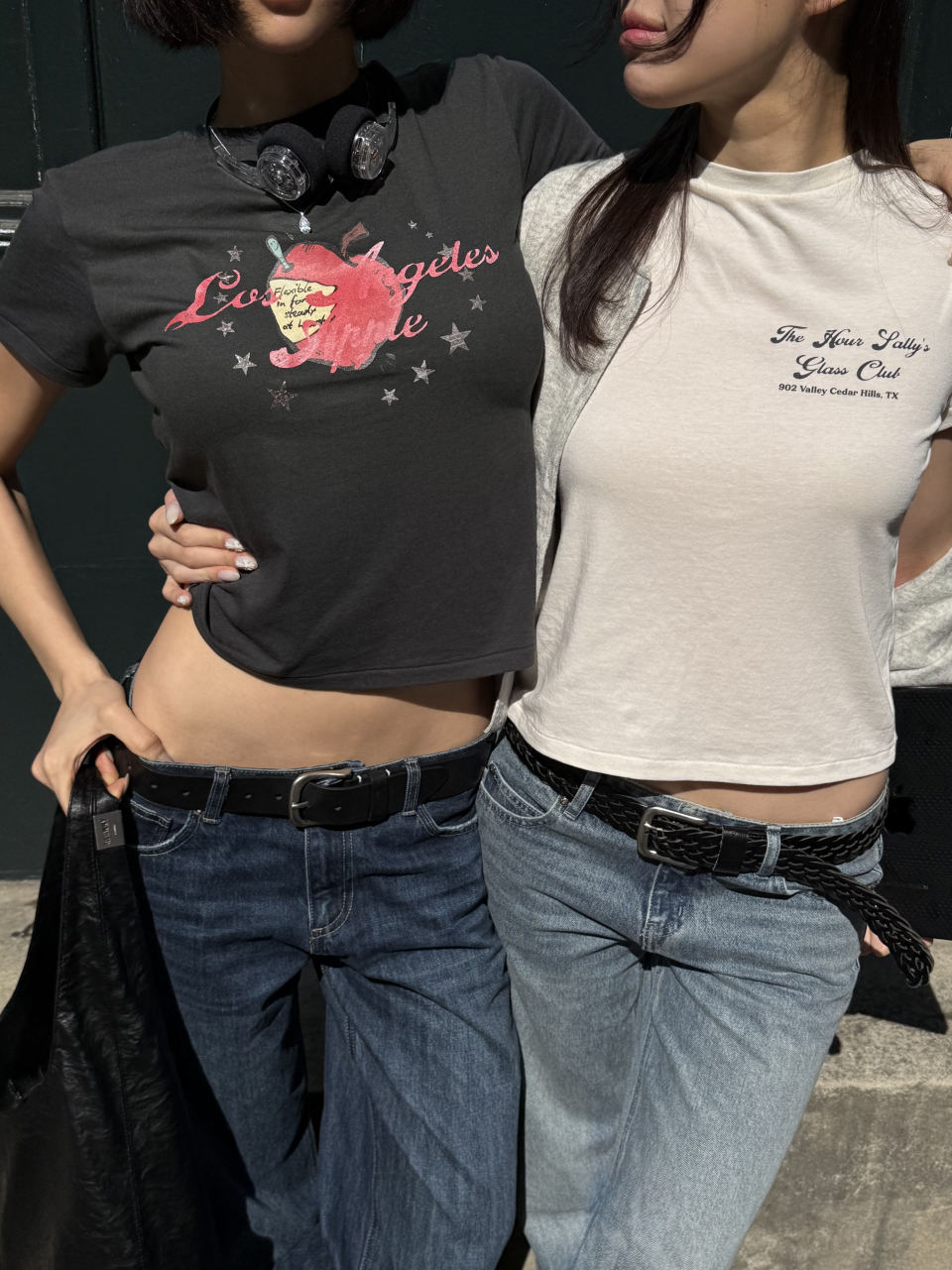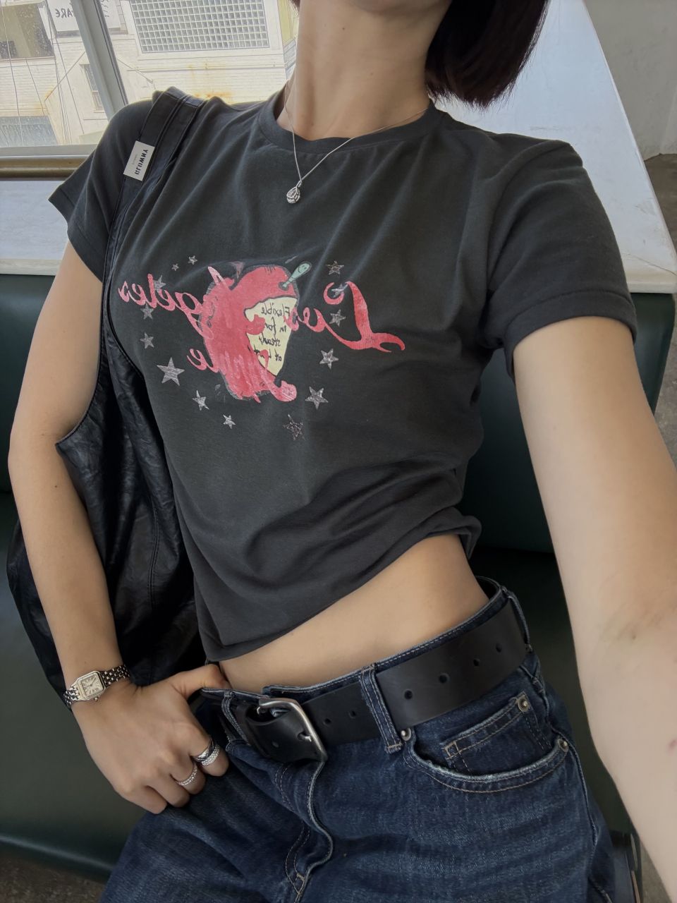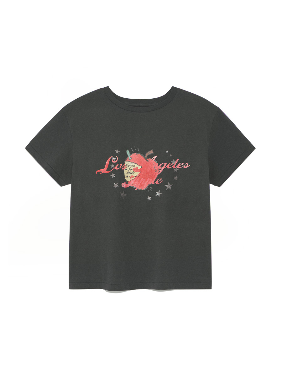 앞판에는 직접 제작한 사과 그래픽 나염을 더해 포인트를 주었으며, 빈티지한 워싱 느낌의 나염 표현으로 자연스럽고 감각적인 분위기를 완성했습니다.