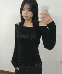 언발 스냅 버튼 보트넥 레터링 오프숄더 롱 슬리브 티셔츠_3COLOR