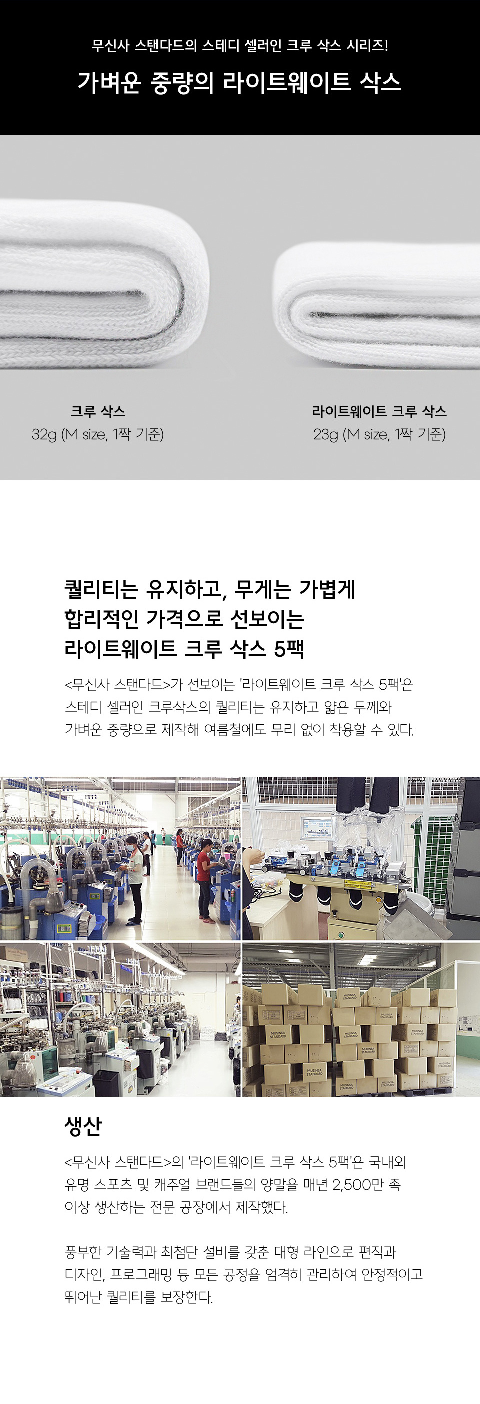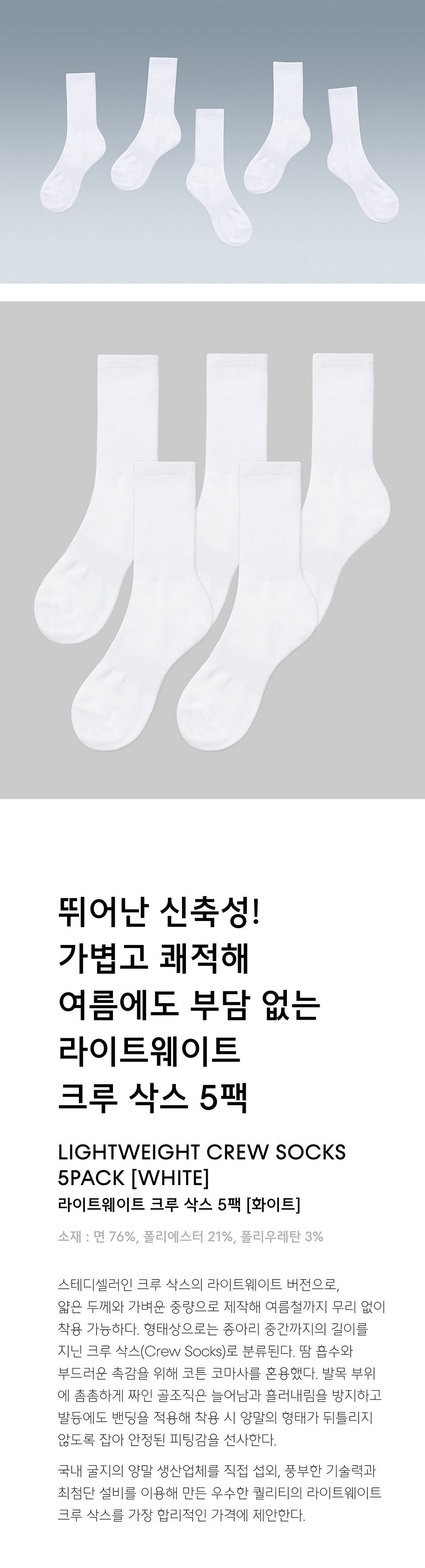 라이트웨이트 크루 삭스 5팩 [화이트]