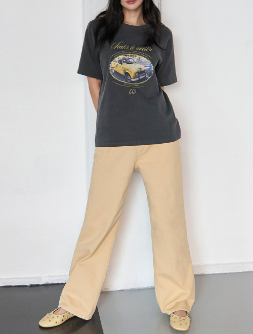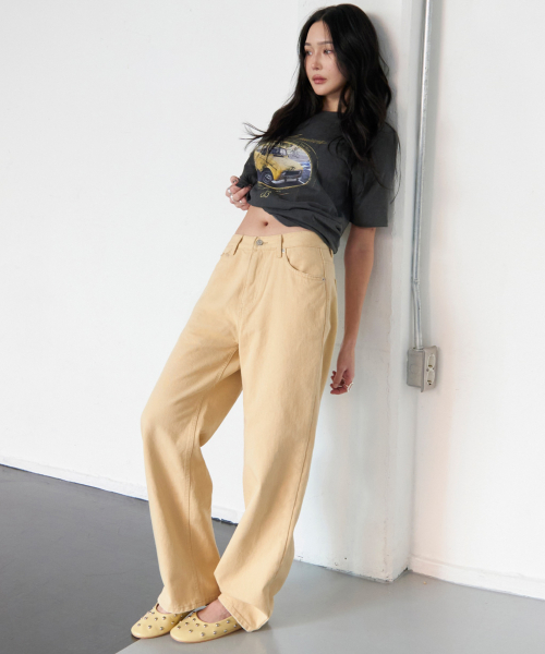 - 롱한 기장감의 와이드 핏으로 자연스러운 체형 커버 연출