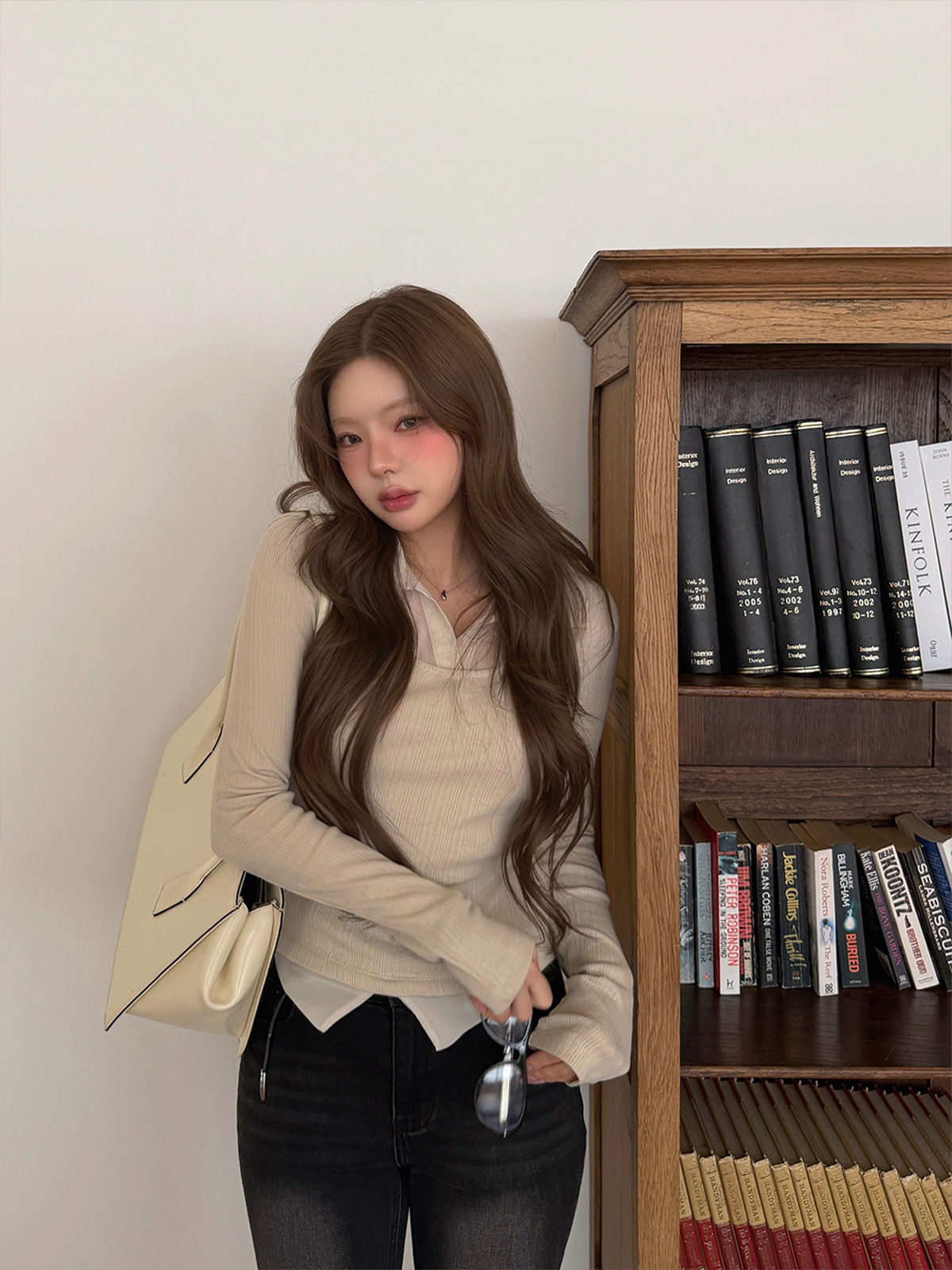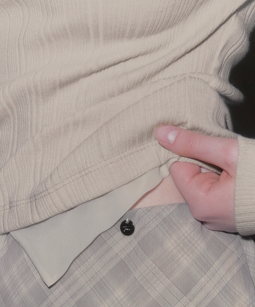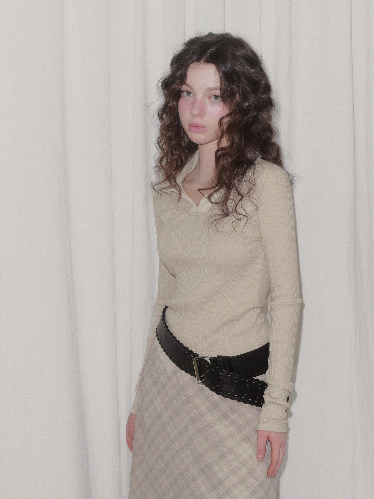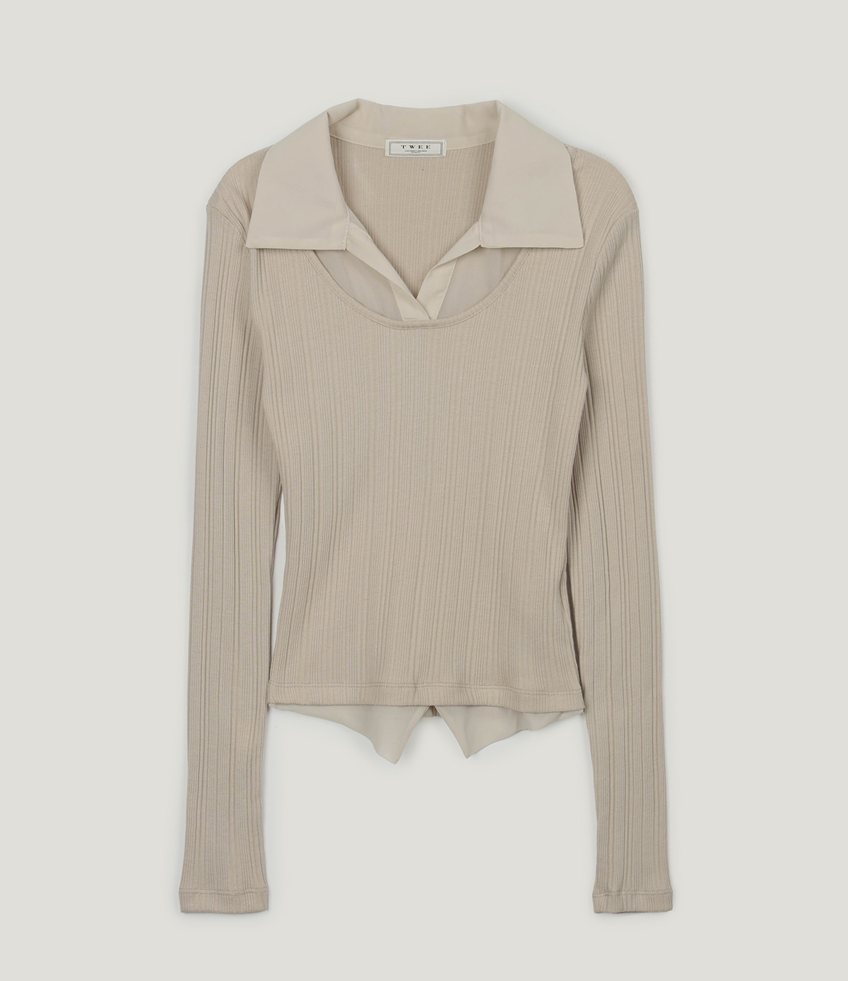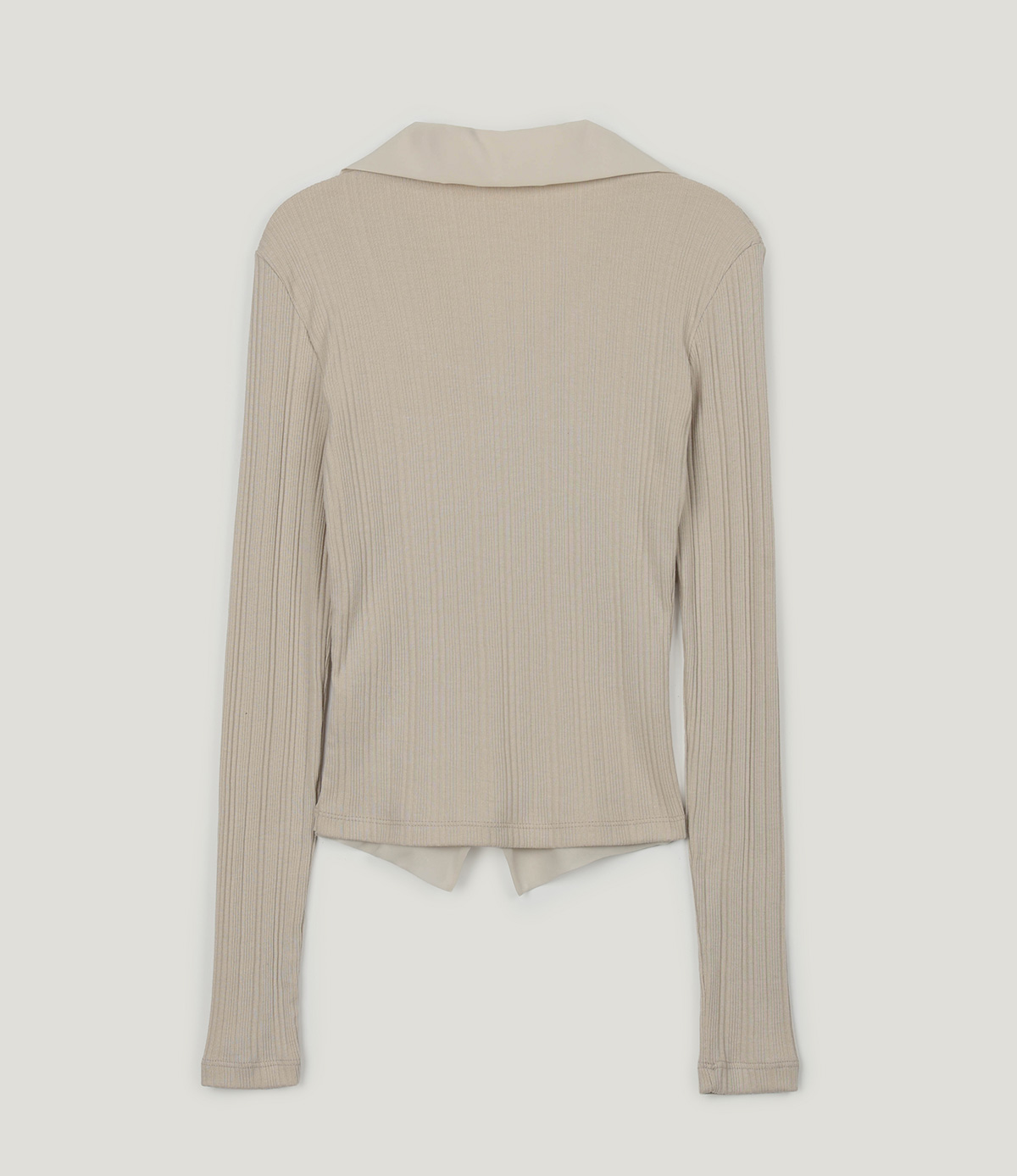 르벨 시스루 카라 골지 긴팔 티셔츠