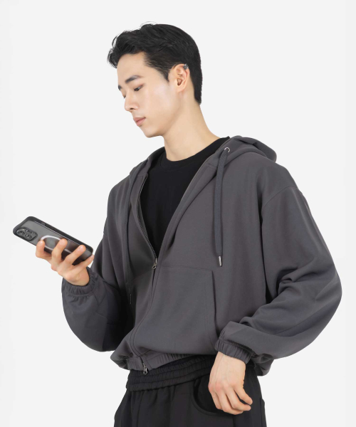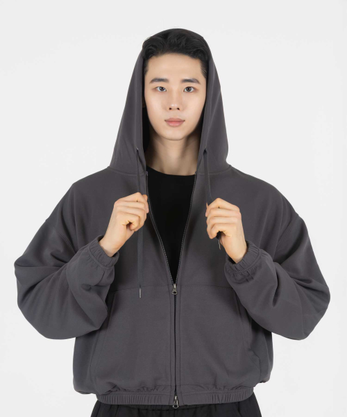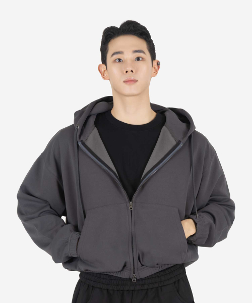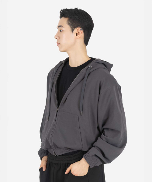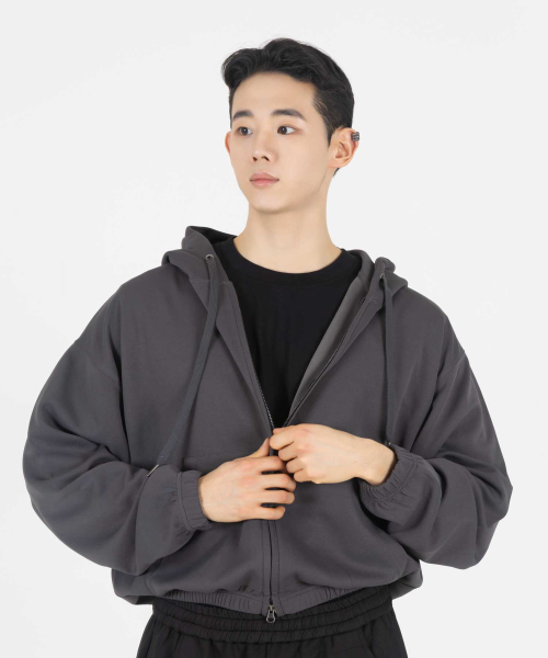 심플 컴포트 오버핏 TWO - WAY 세미크롭 후드 집업 (CHARCOAL)