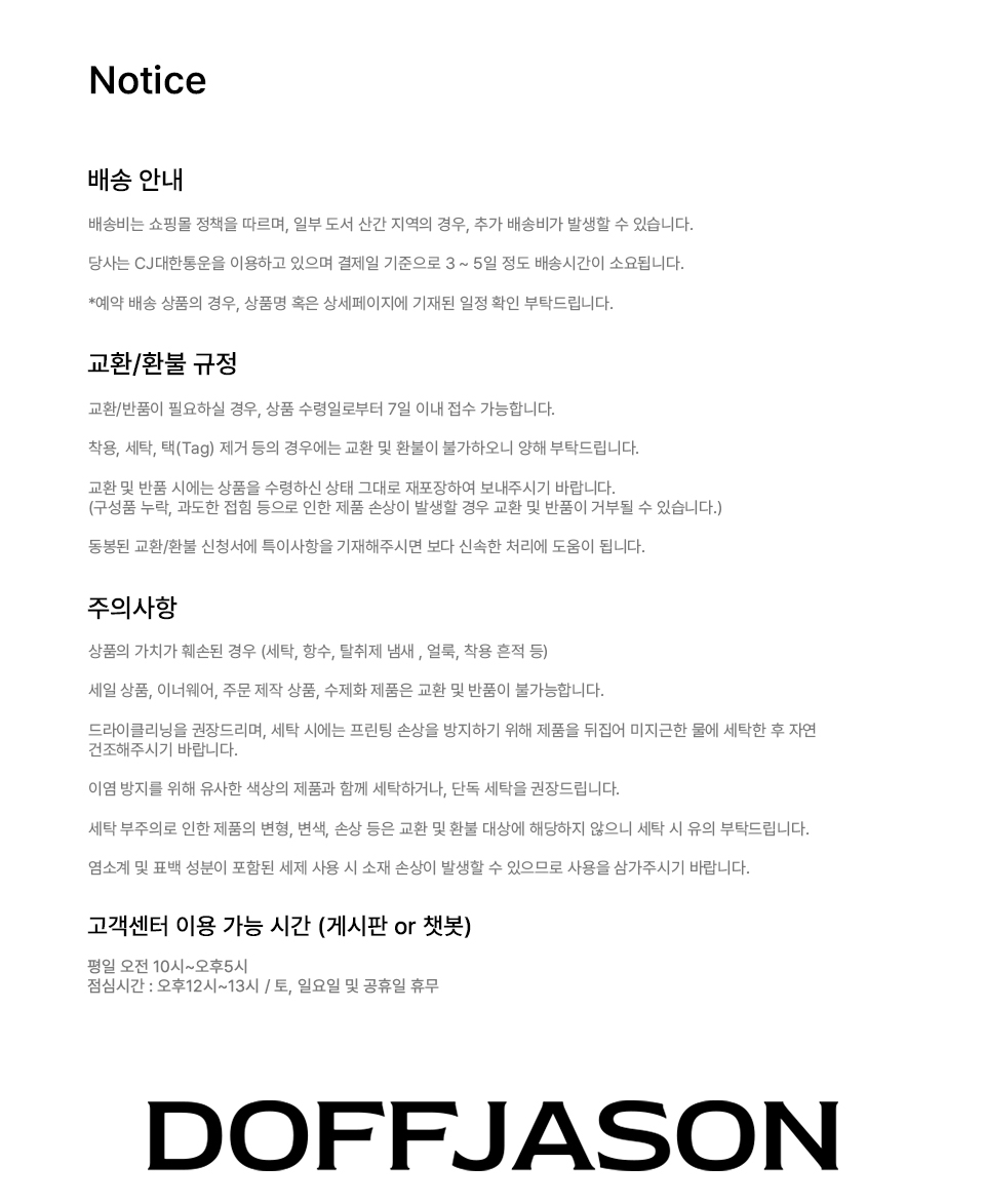 도프제이슨(DOFFJASON)은 가죽이라는 소재에 대한 이해를 기반으로 레더 가먼츠를 중심으로 디자인하는 브랜드입니다. 스타일에 구애받지 않고 오래 입을수록 가치를 더하는 타임리스 디자인을 추구하고, 절제된 디테일과 뛰어난 퀄리티의 아이템을 선보입니다.