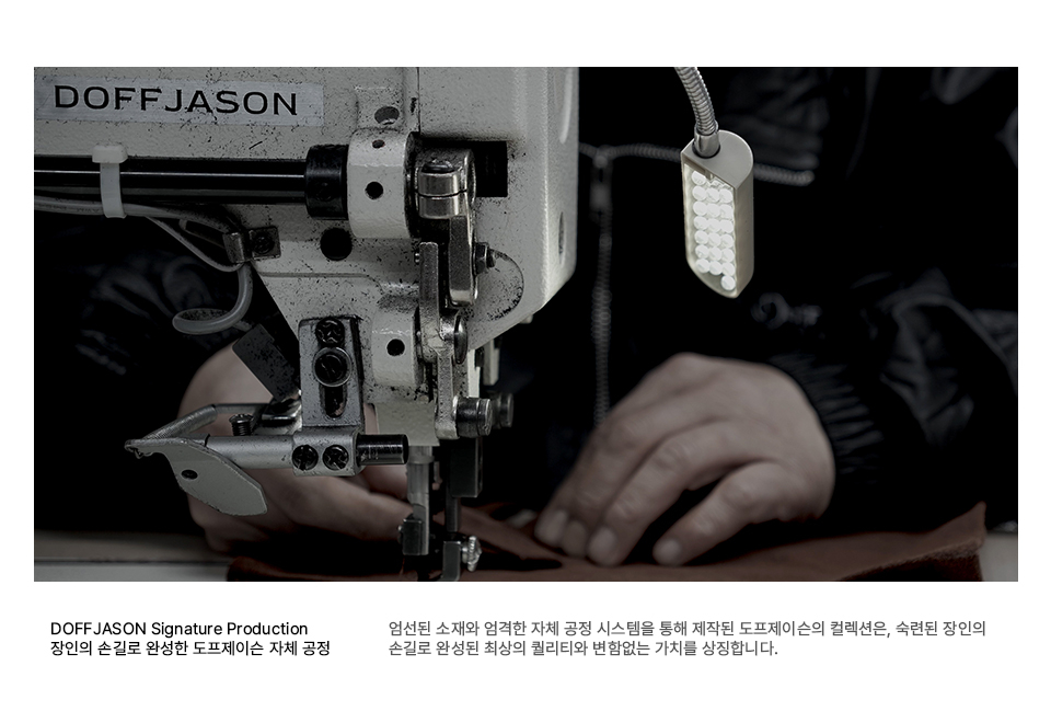 도프제이슨(DOFFJASON)은 가죽이라는 소재에 대한 이해를 기반으로 레더 가먼츠를 중심으로 디자인하는 브랜드입니다. 스타일에 구애받지 않고 오래 입을수록 가치를 더하는 타임리스 디자인을 추구하고, 절제된 디테일과 뛰어난 퀄리티의 아이템을 선보입니다.