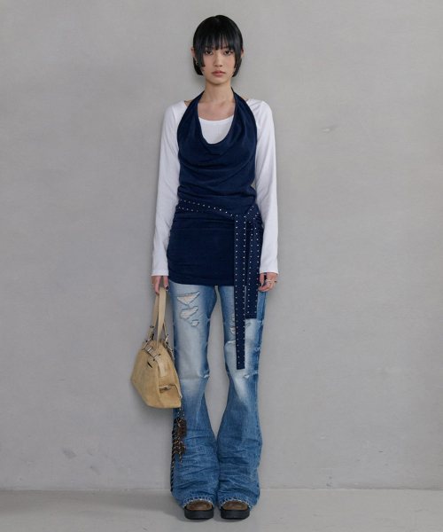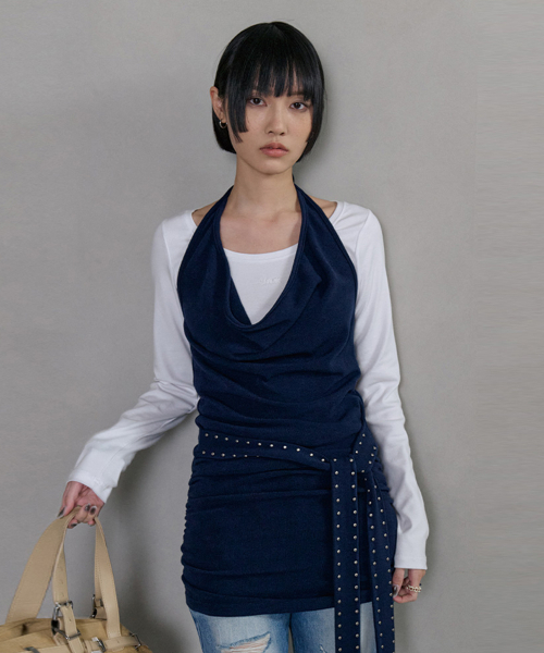 홀터넥 아일렛 벨티드 슬리브리스 드레스 (네이비)