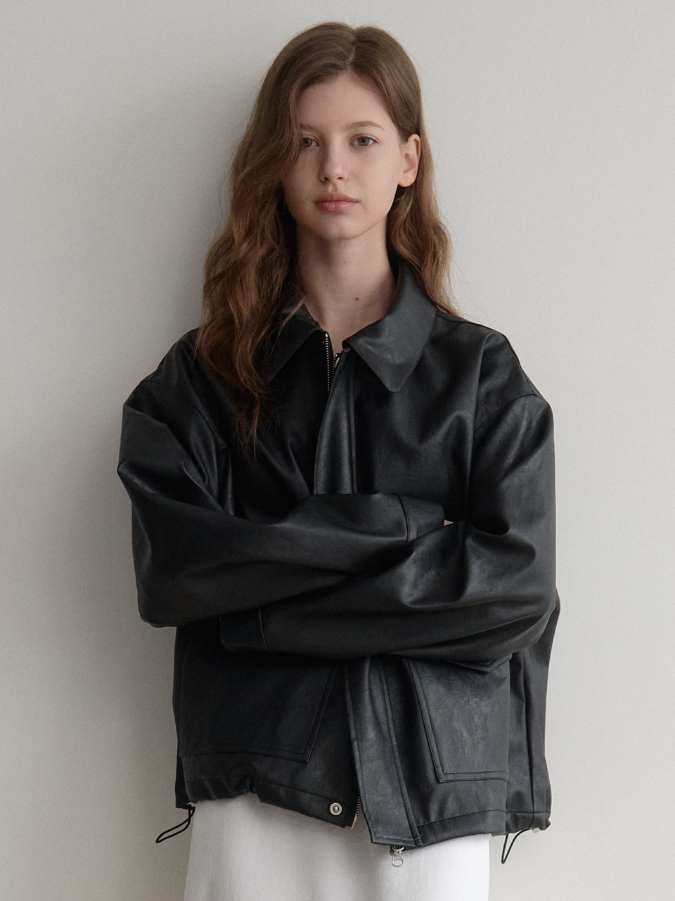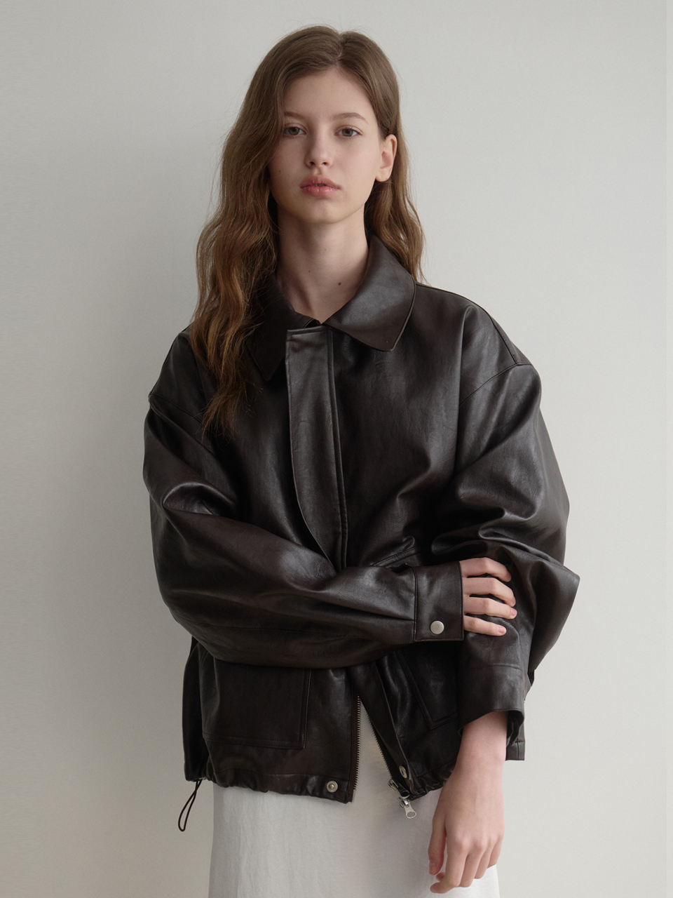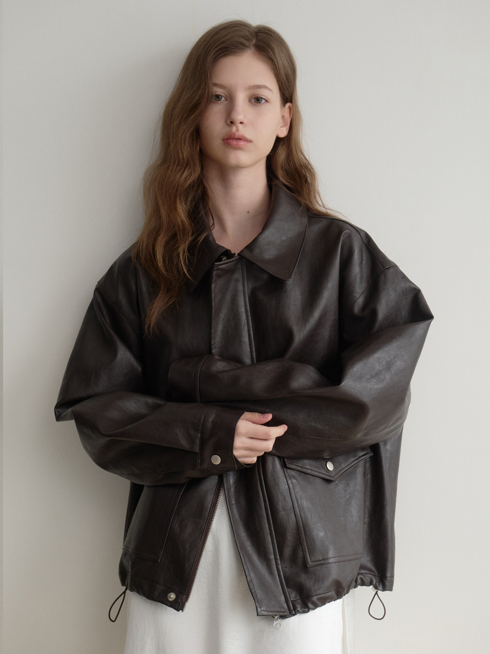Les 포켓 레더 봄버 블루종(brown)