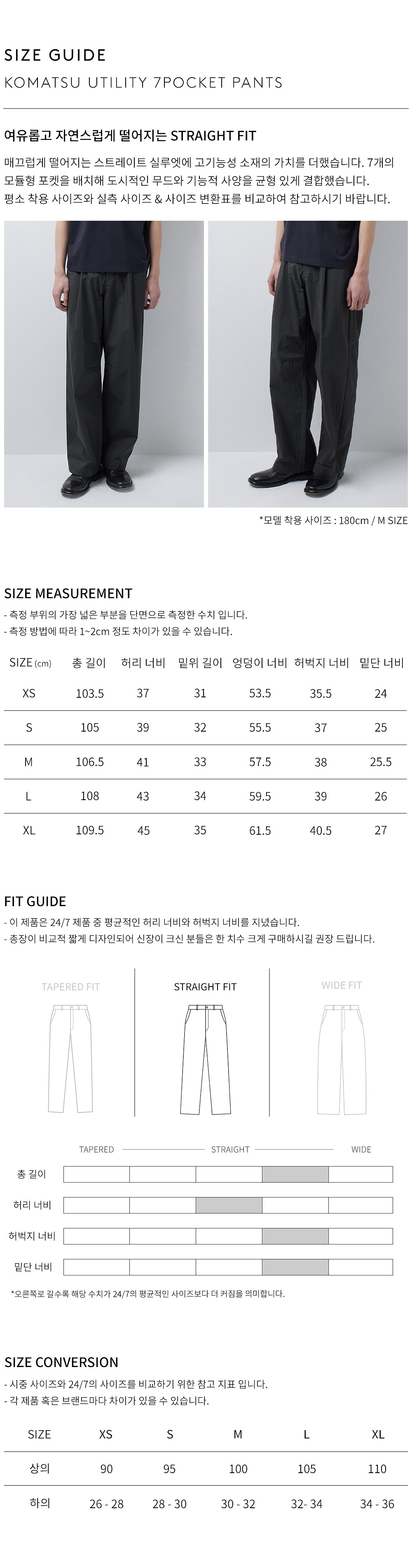 핏은 여유 있는 스트레이트 실루엣을 기반으로, 허리 내부에는 이밴드 + 스트링이 내장되어 있어 벨트 없이도 유연하게 허리를 조절하실 수 있습니다. 또한 벨트고리(LOOP)가 포함되어 있어 액세서리 장착이나 외부 스트랩 활용이 가능하며, 7개의 포켓은 형태와 깊이를 달리해 각각의 기능성을 고려해 배치했습니다.