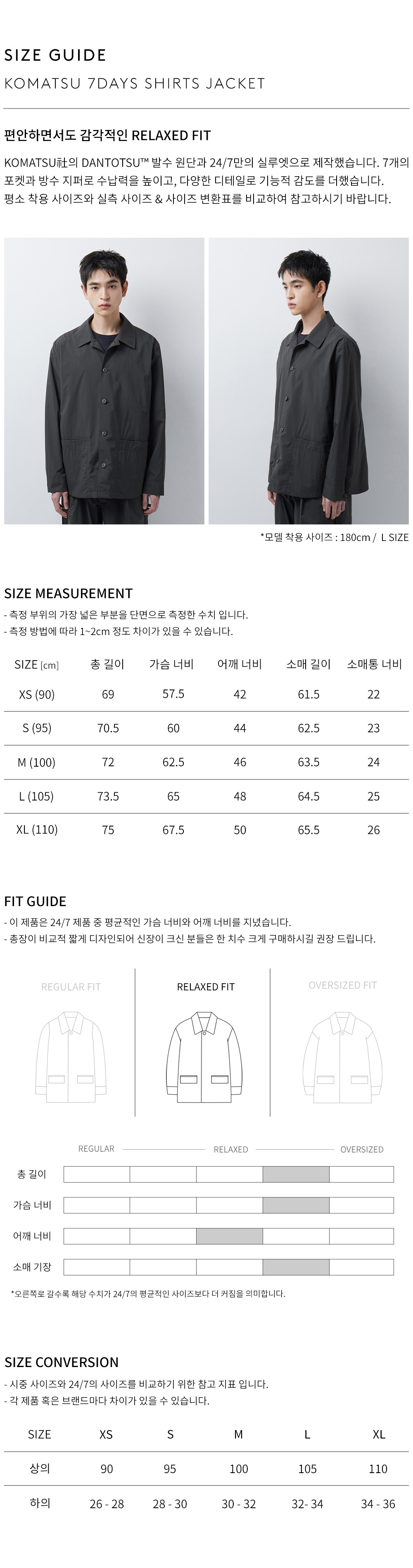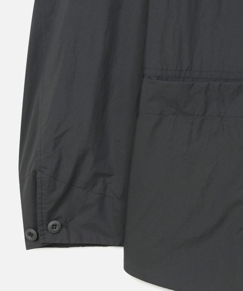 전체 실루엣은 셔츠형 아우터를 기반으로 편안한 실루엣으로 구성되었으며, 앞여밈은 단추 방식으로 마감되어 자켓과 셔츠의 중간 지점을 유지합니다. 소매는 버튼 여밈 방식으로 조절 가능해, 롤업하거나 실루엣을 조절할 때 유용하게 활용할 수 있습니다. 뒷넥에는 행거 루프가 내장되어 실내 보관 시에도 편의성을 더했습니다.