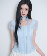 리본 타이 스퀘어넥 블라우스 블루