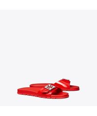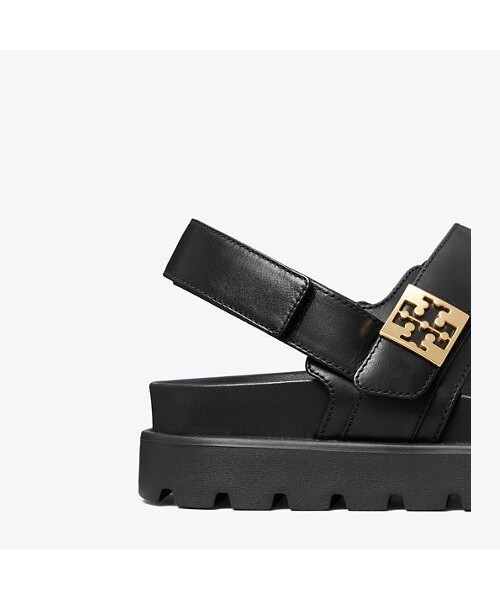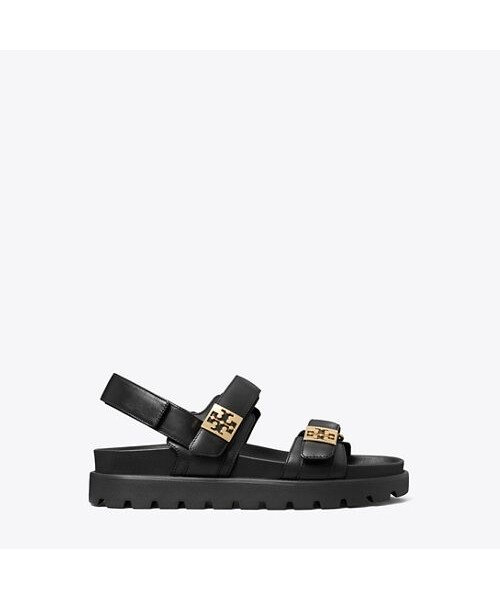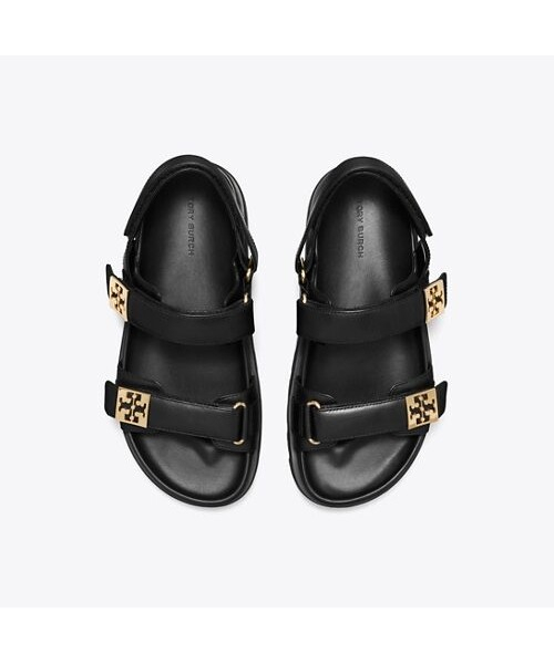 편안함과 세련된 스타일을 동시에 선사하는 샌들입니다. 부드러운 가죽 스트랩과 쿠션감 있는 발바닥 디자인으로 하루 종일 편안하게 착용할 수 있습니다. 벨크로 형태의 투 밴드 스트랩으로 발볼에 맞게 조정이 가능하며, 뒤꿈치 쪽 밴드를 이용하여 쉽게 신고 벗을 수 있습니다. 더블 T 로고가 들어간 사각 메탈 플레이트 장식이 토리버치의 아이덴티티를 더합니다.