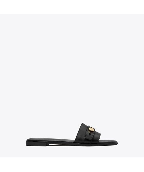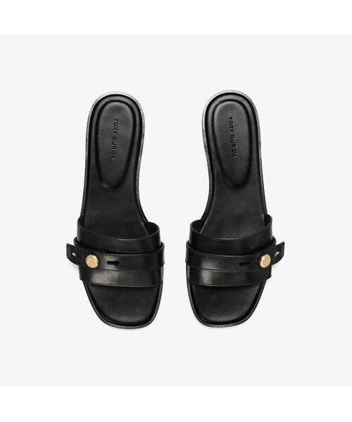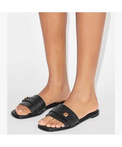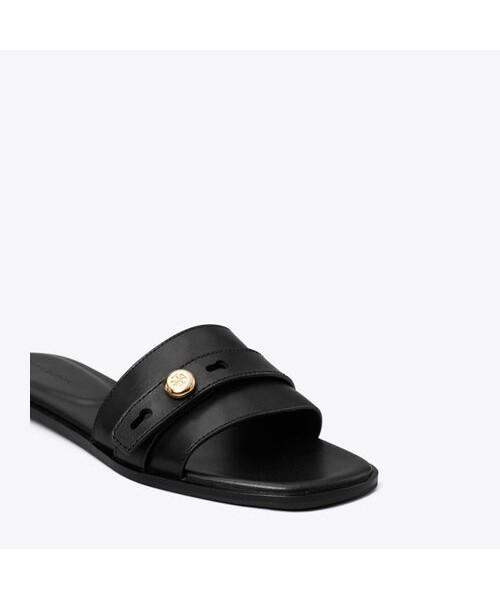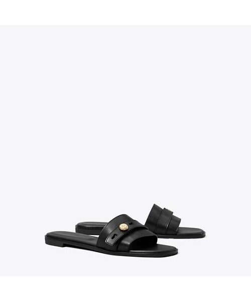 미니멀한 레더 슬라이드로, 더블 스트랩 위 골드 버튼 장식이 포인트를 더해 모던하면서도 세련된 분위기를 완성합니다. 얇고 안정적인 플랫 솔 구조로 가볍게 착화하기 좋으며, 여름 시즌 데일리 룩부터 휴양지 스타일까지 다양하게 매치 가능한 제품입니다.