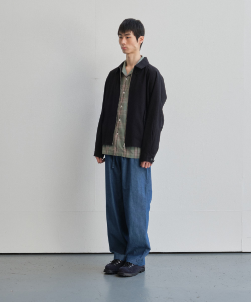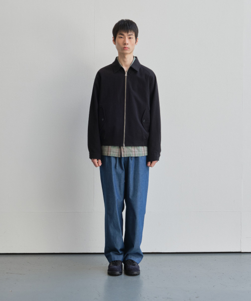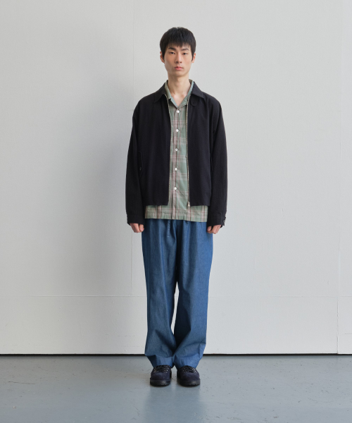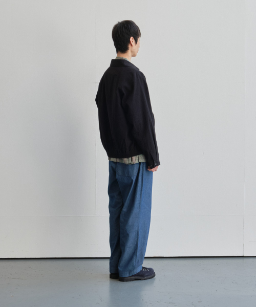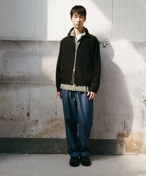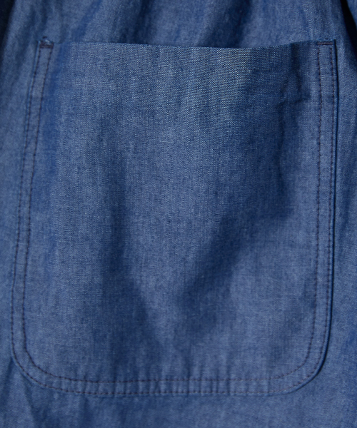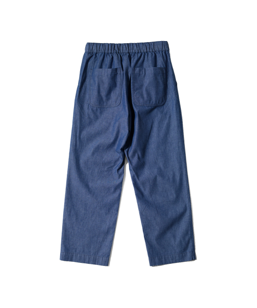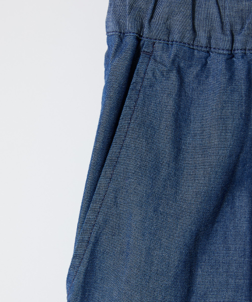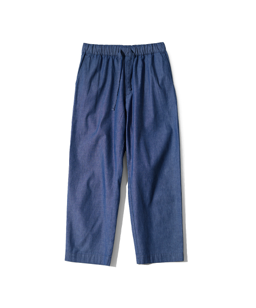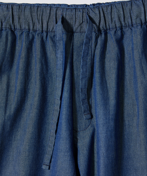 Core Point : 깊은 인디고 컬러와 섬세한 슬럽사를 사용한 샴브레이 소재로, 코브 팬츠 디자인에 적용