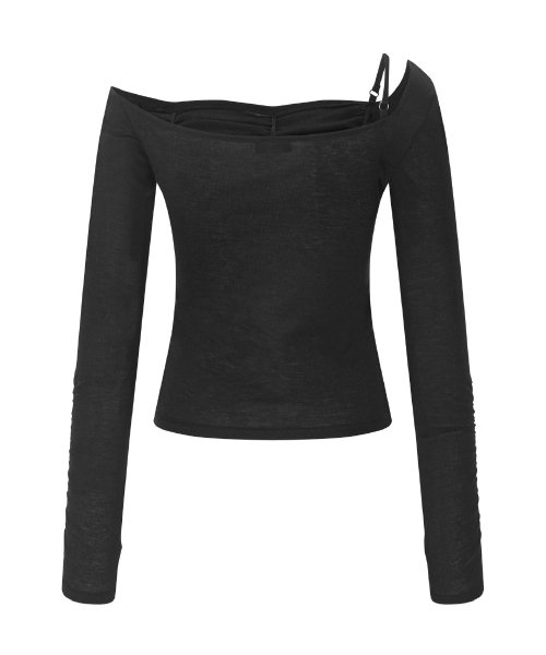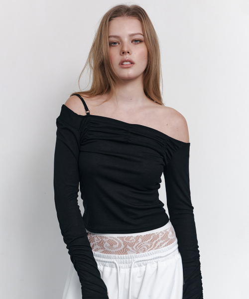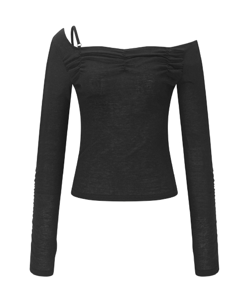 Halo Unbal Shirring Long Sleeve Top (Black)