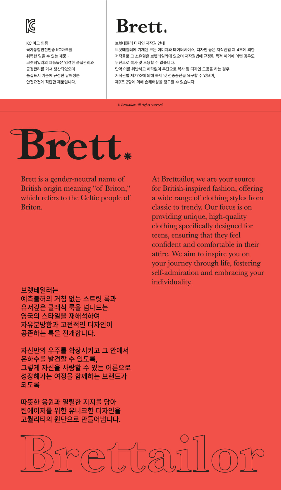 브렛테일러(BRETTAILOR)는 '영 클래식, 뉴 스트릿'이라는 모토 아래 예측불허의 거침없는 스트릿 룩과 유서 깊은 클래식 룩을 넘나드는 영국 스타일을 재해석하여, 자유분방함과 고전적인 디자인이 공존하는 룩을 전개하는 브랜드입니다.