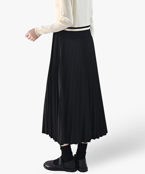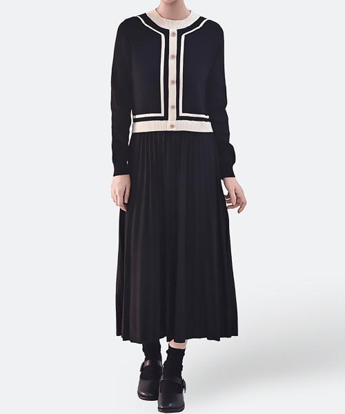 하객룩 니트 배색 플리츠 롱원피스_블랙