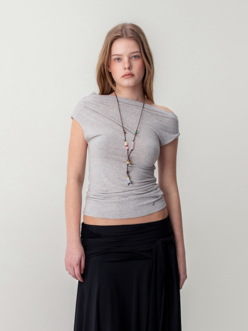 언발란스한 숄더 디자인이 쇄골과 어깨 라인을 우아하게 드러내며, 전체적으로 여성스럽고 세련된 무드를 완성합니다.