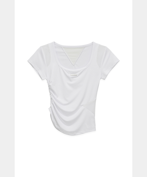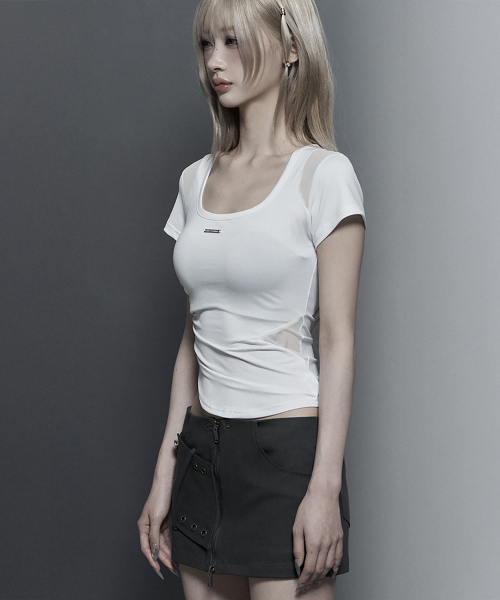 -스퀘어 넥 라인이 돋보이는 슬림 핏 숏 슬리브 탑