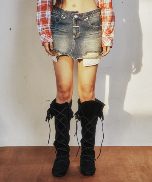 DESTROYED DOUBLE DENIM SKIRT BLACK