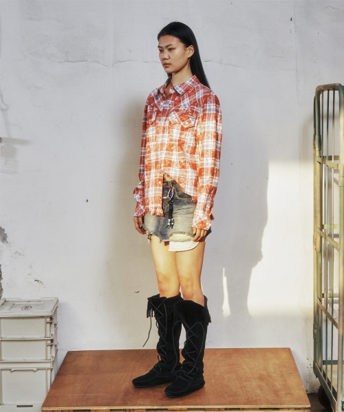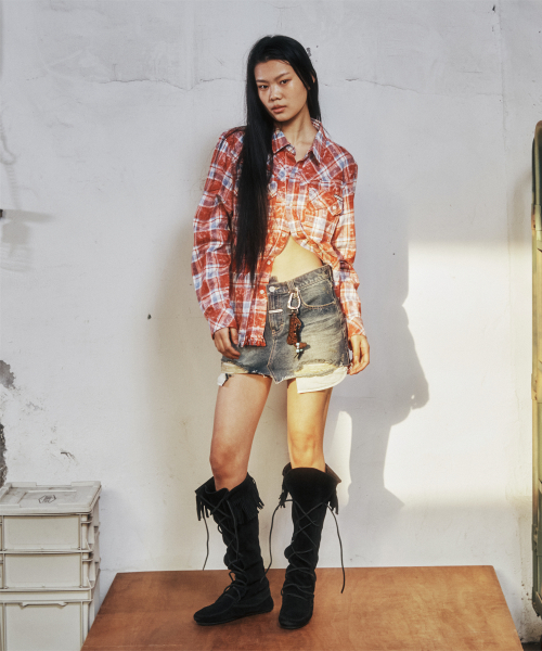 UNBALANCE LAYERED CHECK SKIRT (W) BROWN