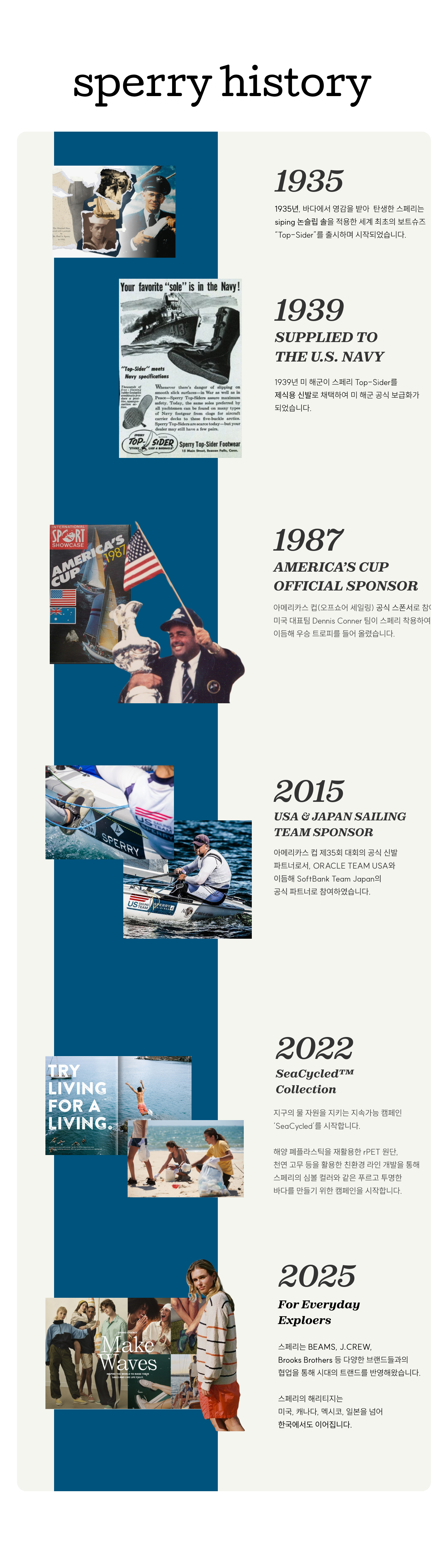 스페리(SPERRY)는 1935년, 바다 위에서 태어난 항해와 탐험의 정신으로 오늘날까지 이어지고 있습니다. 아메리칸 헤리티지를 대표하는 라이프스타일로서, 변치 않는 도전과 자유의 가치를 담아내며 세대를 넘어 전 세계인들에게 영감을 전하는 브랜드입니다.