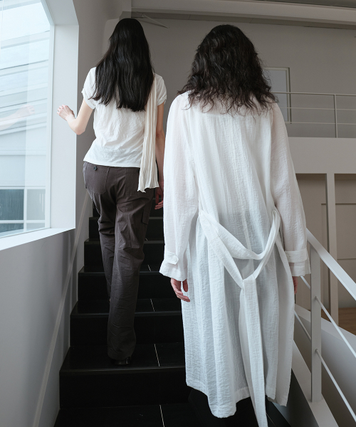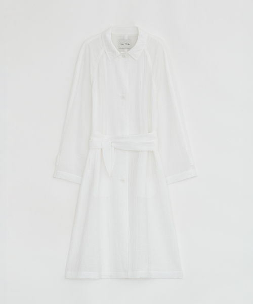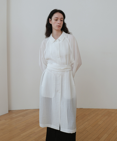 시어한 소재의 롱 트렌치 코트입니다. 전체 안감없이 깔끔하게 제작되었으며, 탈착가능한 벨트를 활용하여 다양한 스타일링이 가능합니다.