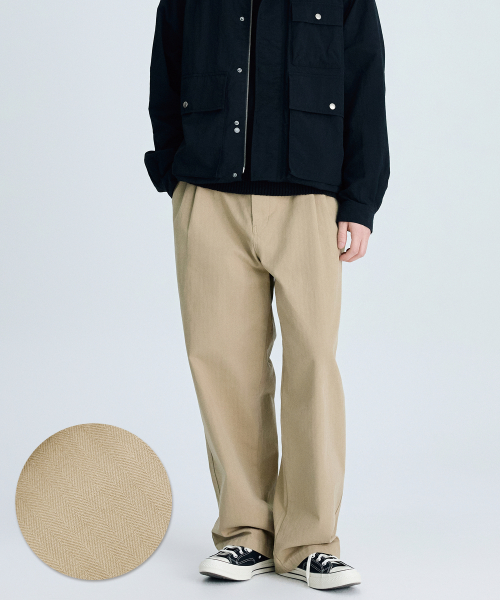 투 턱 헤링본 치노 와이드 팬츠 다크베이지