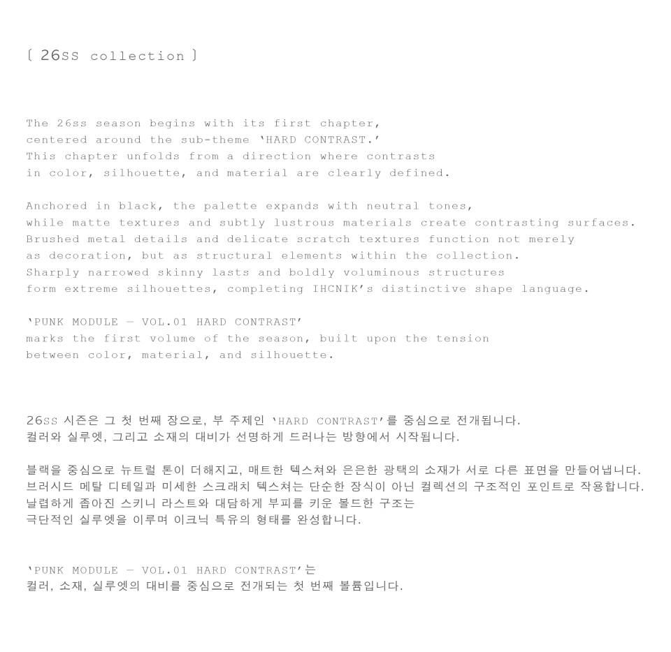 이크닉(IHCNIK)은 다양한 실루엣과 시즌에 구애받지 않는 소재, 과감하지만 정제된 컬러웨이로 빈티지하면서도 트렌디한 아이템을 보다 자유롭고 다양한 시야로 재해석하는 브랜드입니다. 빈티지한 매력과 매혹적인 요소가 어우러진 아이코닉한 스타일을 선보입니다.