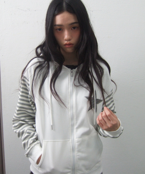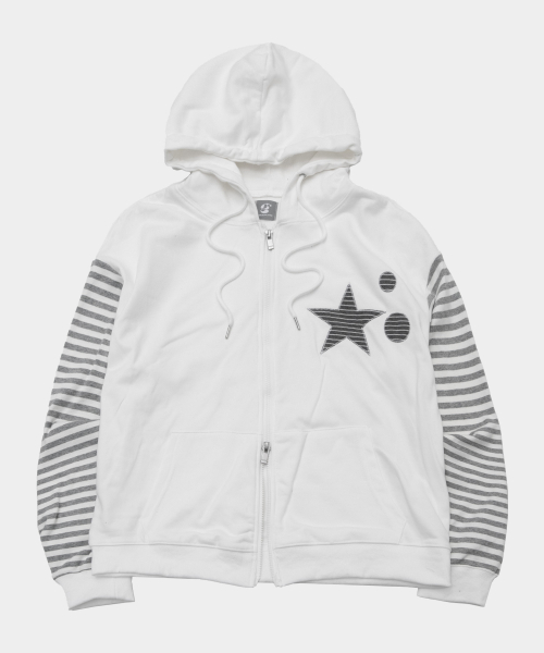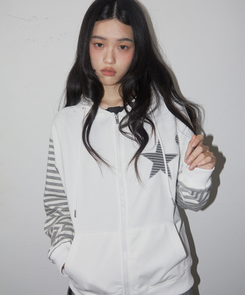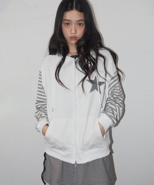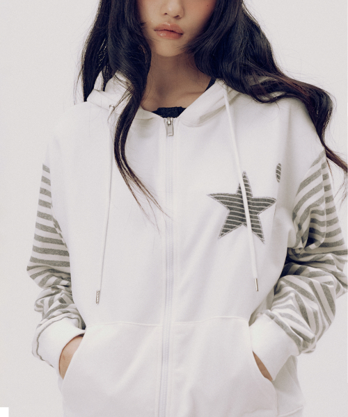 스타 아플리케 스트라이프 컬러 배색 레이어드 후드집업 [화이트]