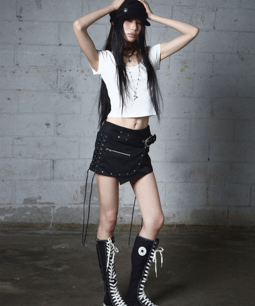 ✦ 빈티지한 텍스처의 페이크 레더 원단으로 제작된 랩 스커트