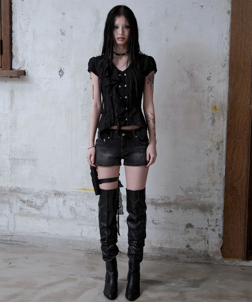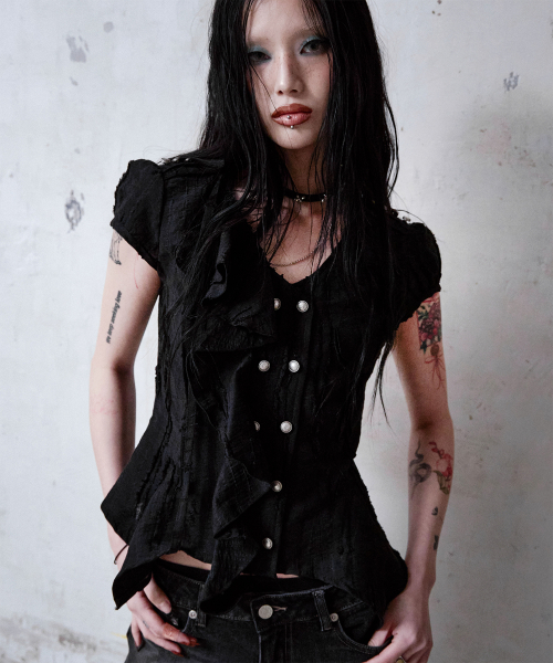 ✦ 그런지한 텍스처의 데미지 원단으로 제작된 더블 브레스트 블라우스