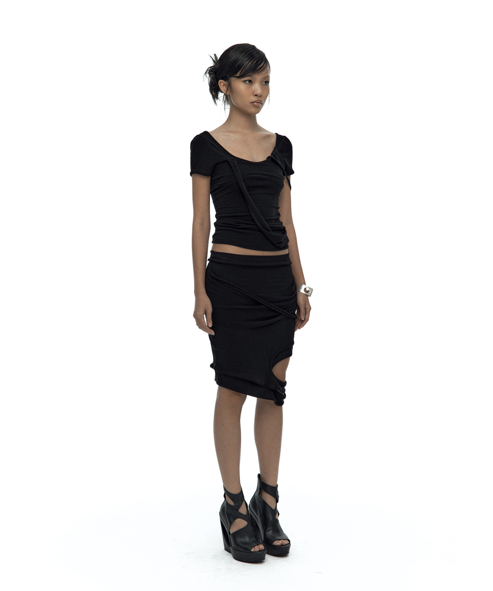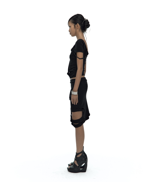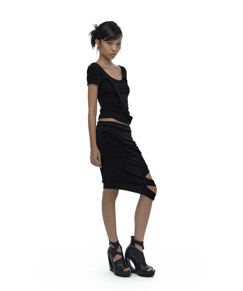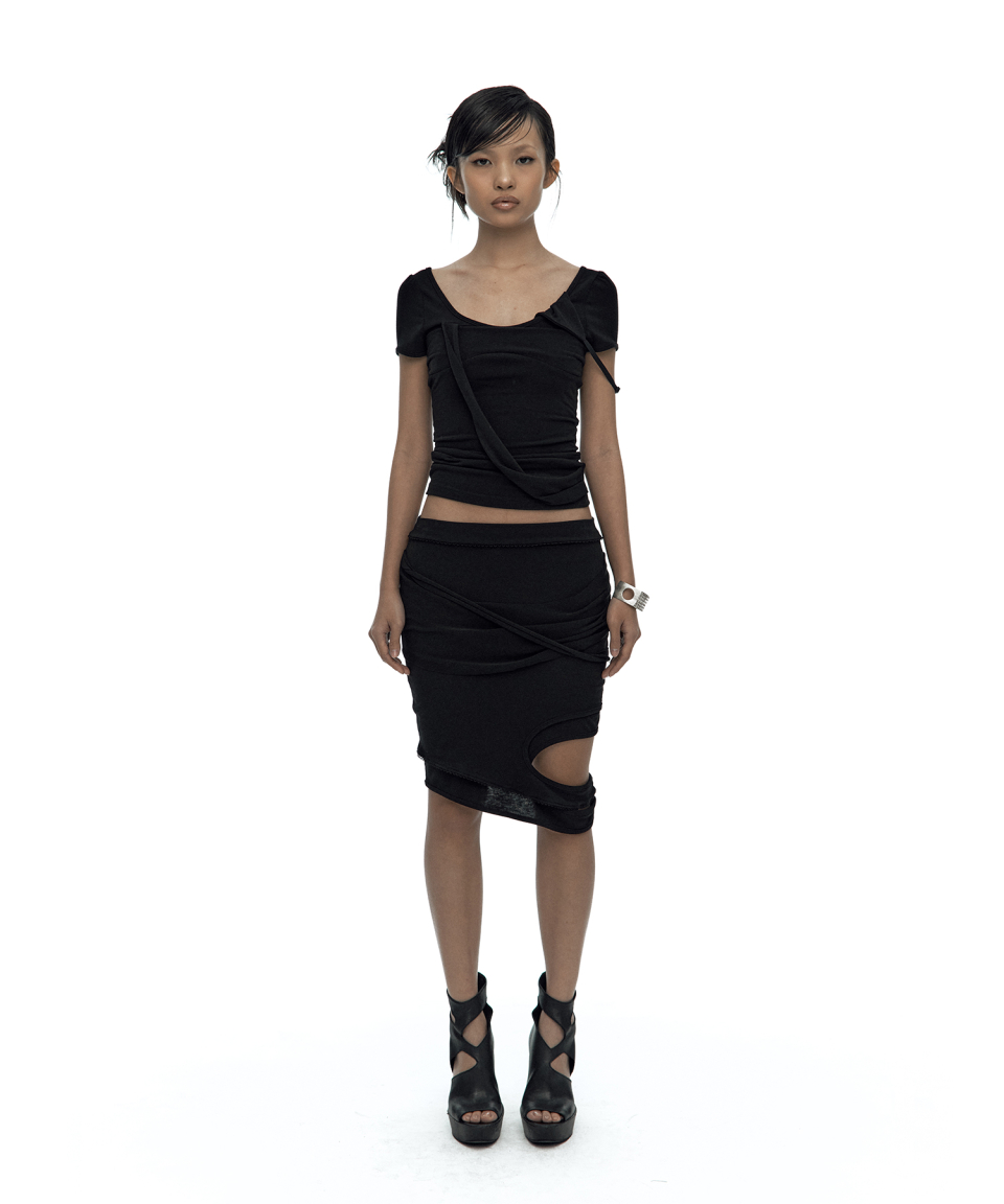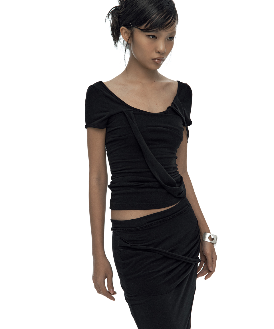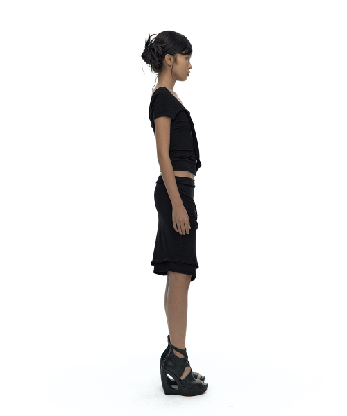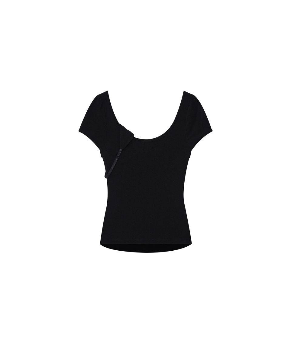 - 허리 셔링 디테일이 들어간 슬림핏 반팔 티셔츠
