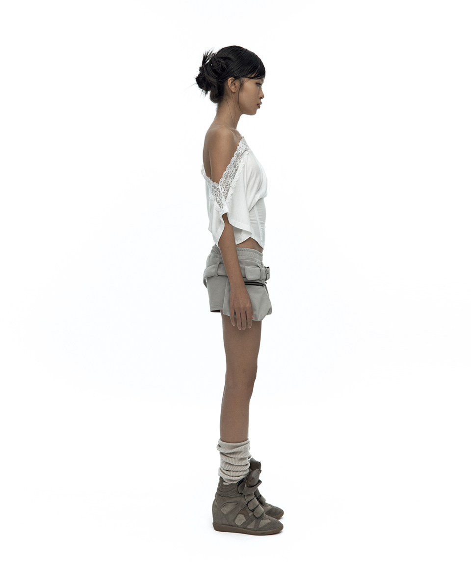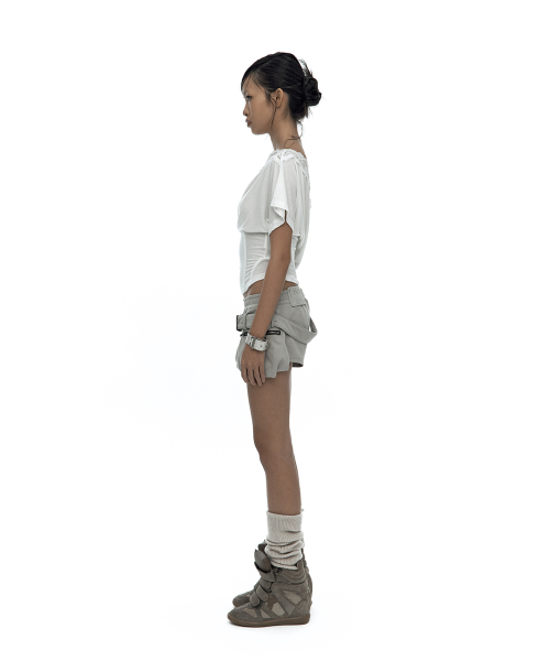 - 양 옆 벨트 디테일이 들어간 마이크로 팬츠