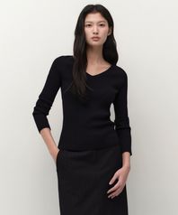 우먼즈 와이드 리브드 슬림 브이 넥 니트 [블랙]