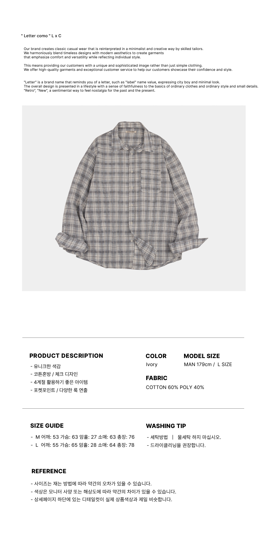 레테르코모(LETTERCOMO)는 새로움(New)과 과거(Retro)를 다양한 표현으로 즐길수 있는 이지와 내추럴을 추구하는 브랜드입니다. 과거와 현재의 향수를 느낄 수 있는 레테르만의 감성있는 옷을 만듭니다.
