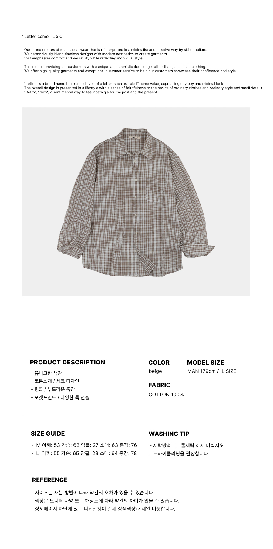 레테르코모(LETTERCOMO)는 새로움(New)과 과거(Retro)를 다양한 표현으로 즐길수 있는 이지와 내추럴을 추구하는 브랜드입니다. 과거와 현재의 향수를 느낄 수 있는 레테르만의 감성있는 옷을 만듭니다.
