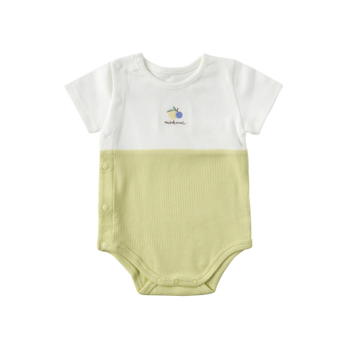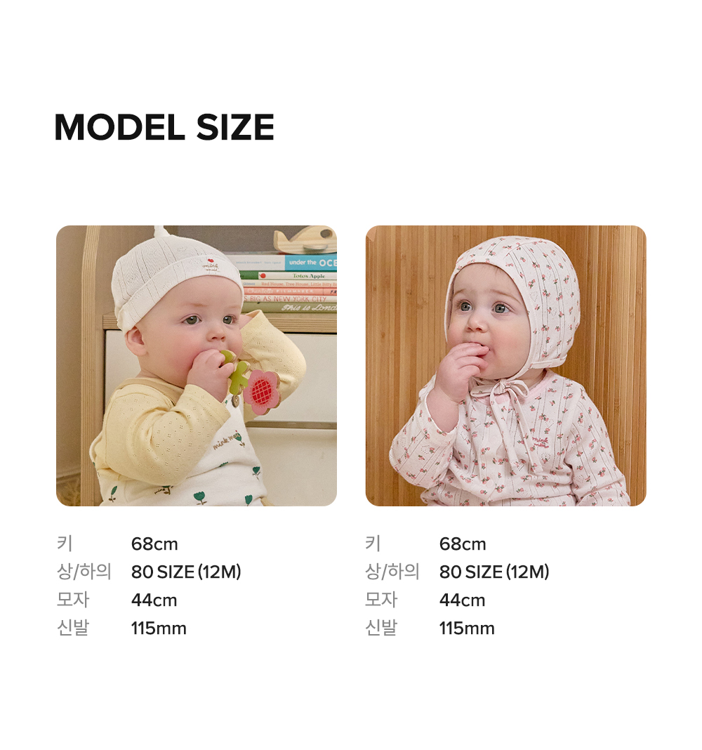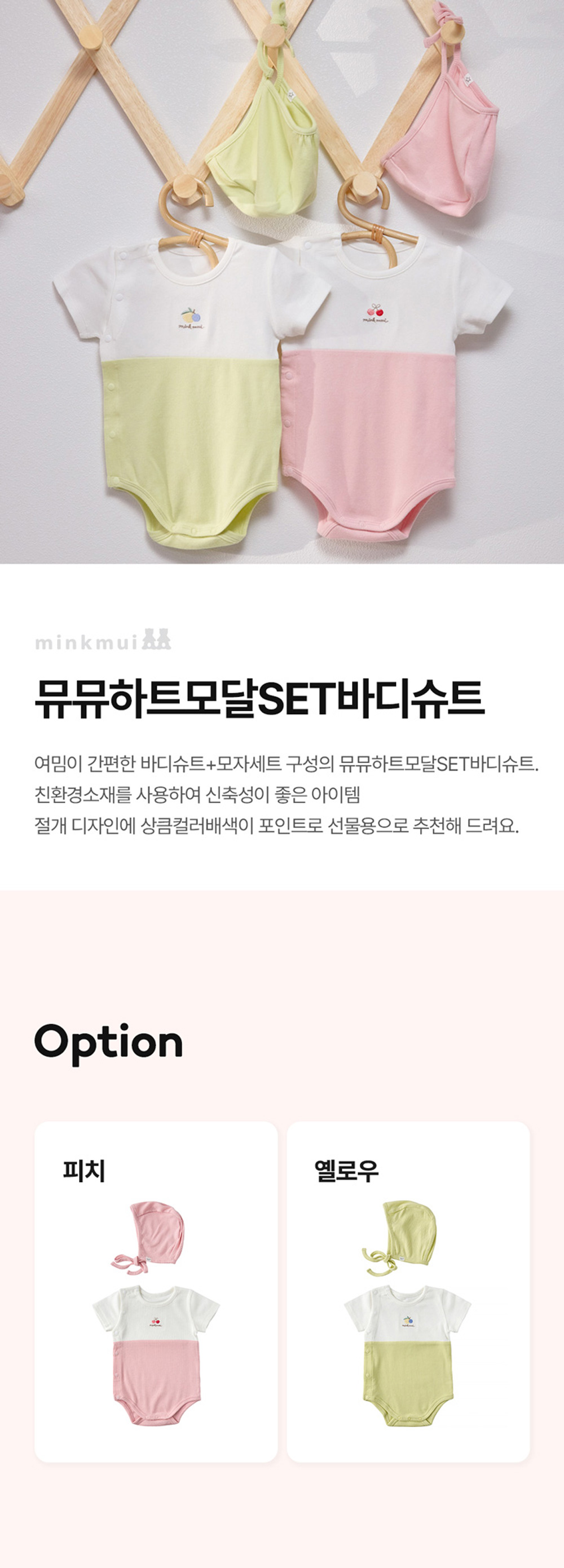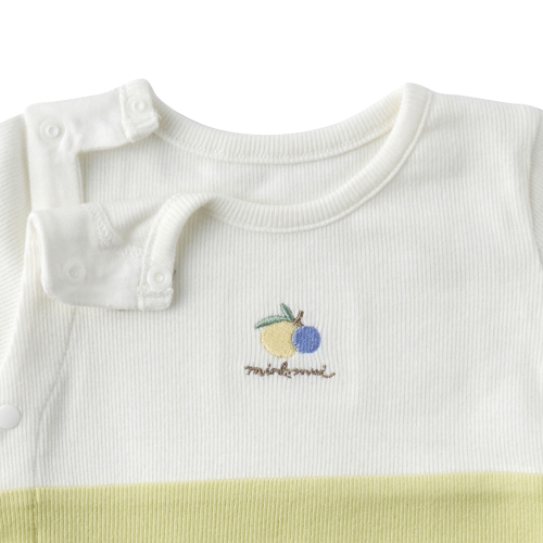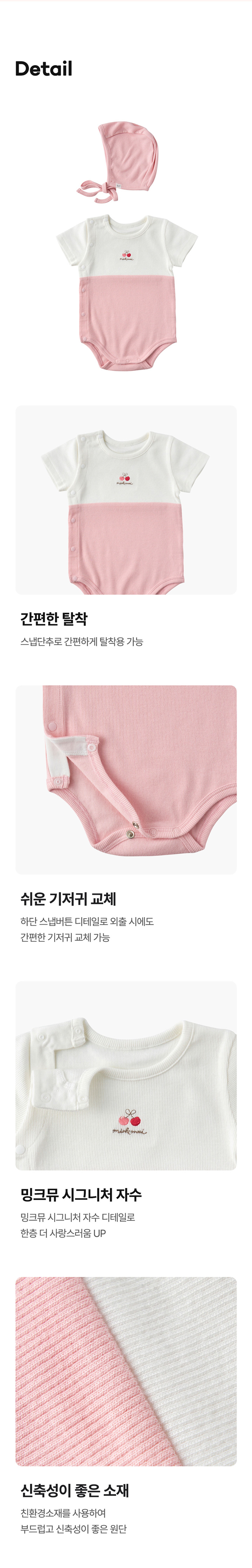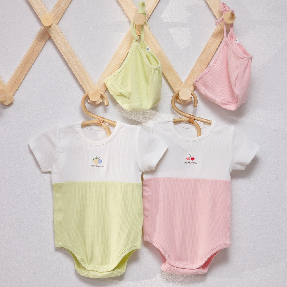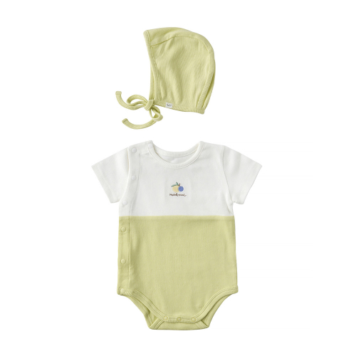 COZY COTTON 라인의 여밈이 간편한 바디슈트 모자SET 아이템입니다. 친환경 섬유인 모달 코튼원사를 신축성이 좋은 잔골 조직에 스판사를 넣어 제직한 원단입니다. 절개 디자인에 상큼한 컬러 배색을 주었고 가슴앞판에 열매 자수를 포인트로 준 디자인으로 아기들에게 선물용으로 구성하기 좋은 아이템 입니다.