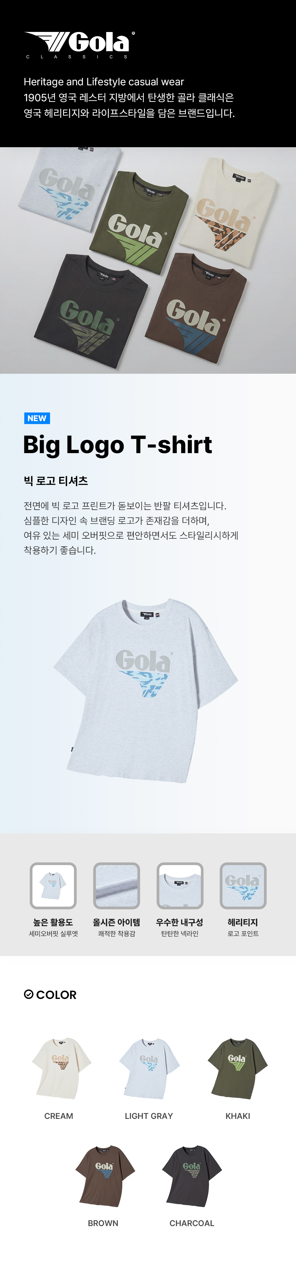 1905년 영국 레스터 지방에서 탄생한 골라(GOLA)는 영국의 헤리티지와 라이프스타일을 담은 브랜드 입니다. 영국을 대표하는 스포츠 브랜드로 자리매김하였으며 라이프스타일과 패션을 함께 아우르는 클래식 라인을 론칭해 전 세계에서 브랜드를 전개하고 있습니다.