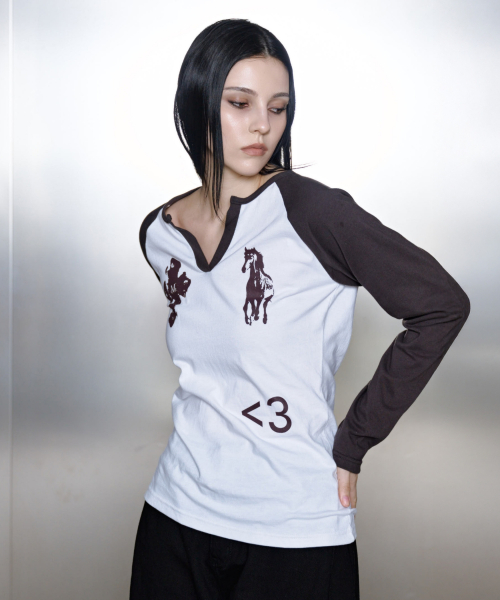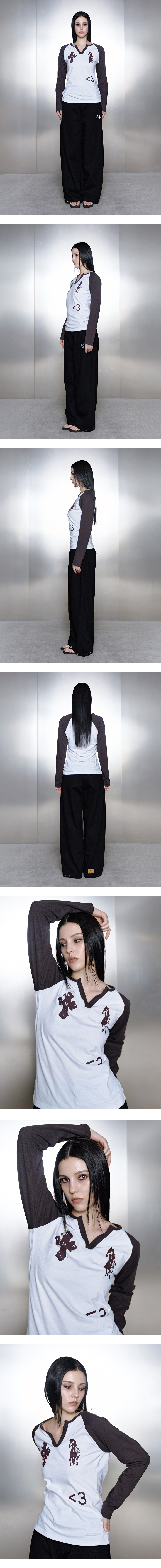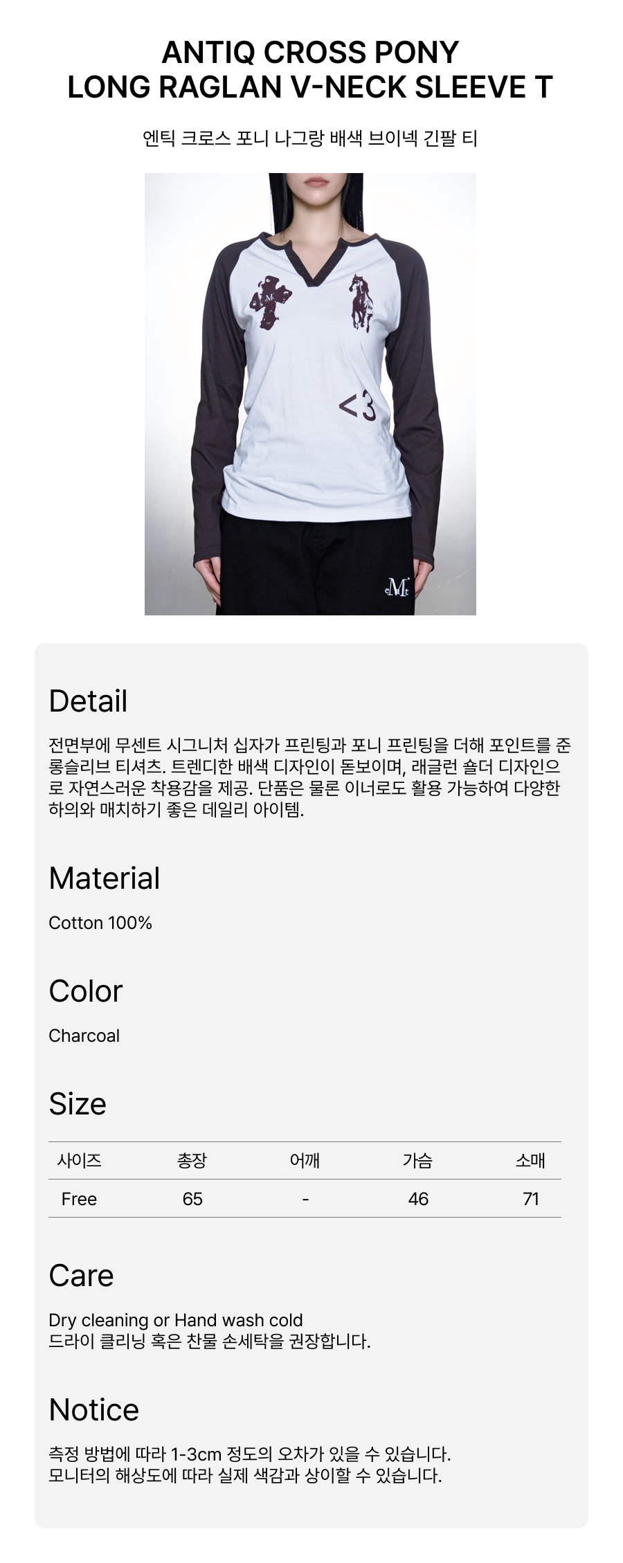 엔틱 크로스 포니 나그랑 배색 브이넥 긴팔 티