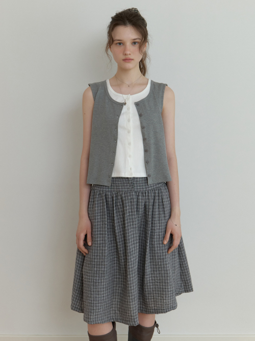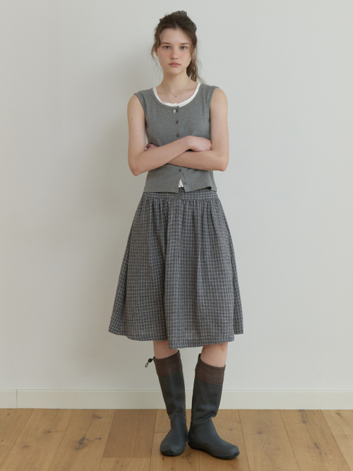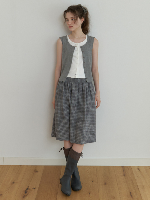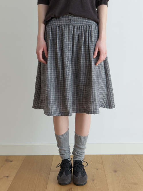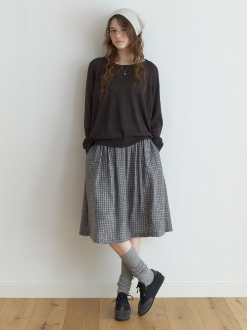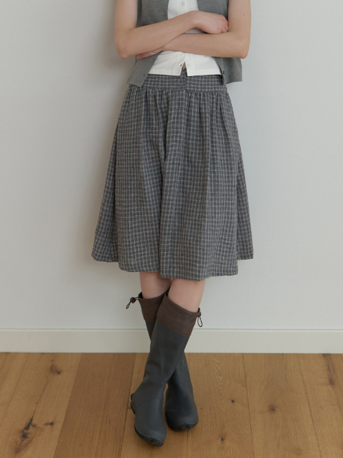 포근한 그레이 베이스에 아이보리 선들이 잔잔하게 그려진 체크 패턴으로 아늑함을 담아낸 스커트입니다. 웨이스트 라인 전체 밴딩 디자인이며, 얇은 밴딩으로 인하여 표현되는 잔잔한 셔링으로 섬세하고 자연스러운 쉐입을 느낄 수 있습니다. 원단 자체에 담긴 은미한 입체감을 느낄 수 있으며, 담백하게 느껴지는 미디 기장감과 여유로운 실루엣, 사이드포켓이 더해져 안정감 있는 착용감을 제공하여 보다 다채로운 체형에 어우러지도록 도와줍니다. 제 원단의 자그마한 싸개 단추로 아기자기한 디테일을 보여주며, 적당한 길이의 허리단으로 밸런스를 잡아 단조로움은 덜어내고 좋은 비율을 유지해 줍니다.