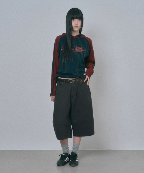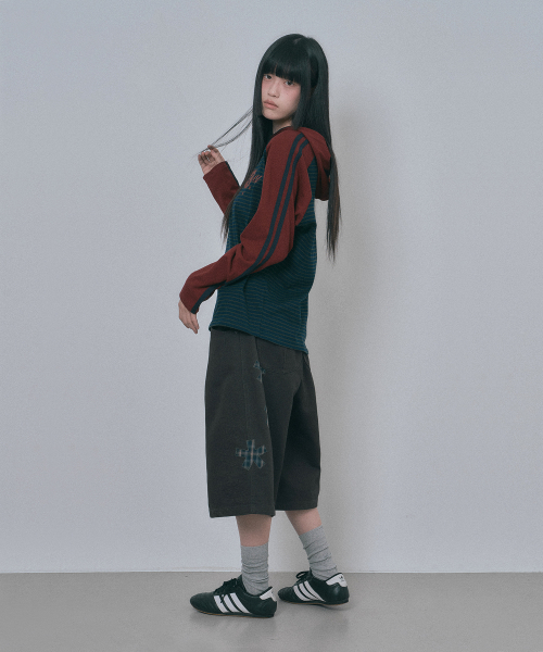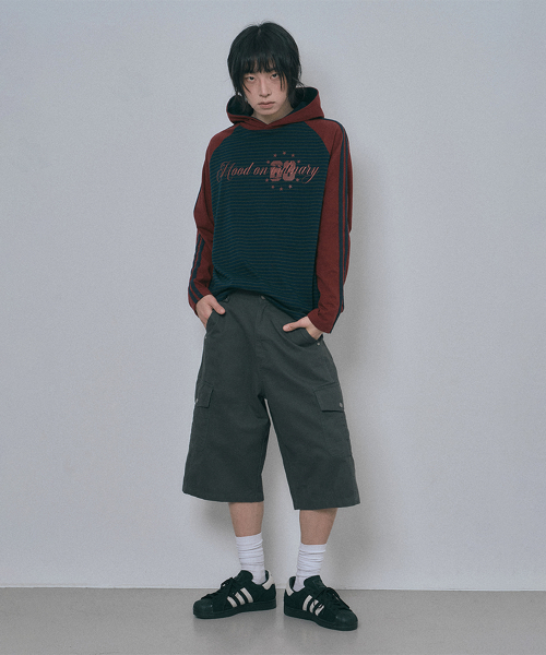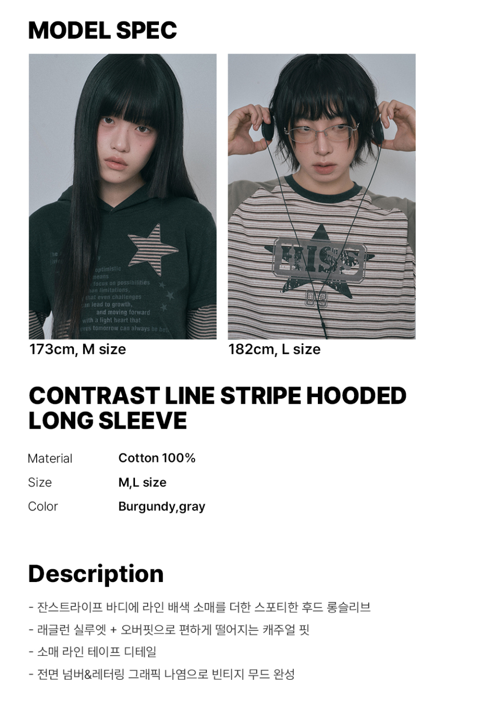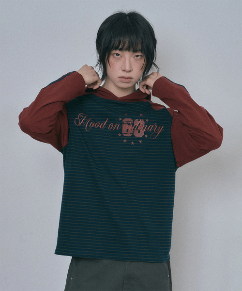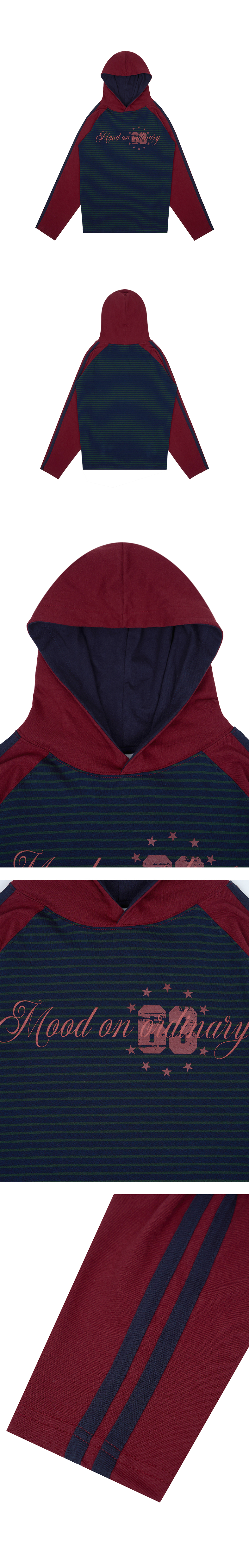 배색 라인 스트라이프 후드 롱슬리브 - 버건디