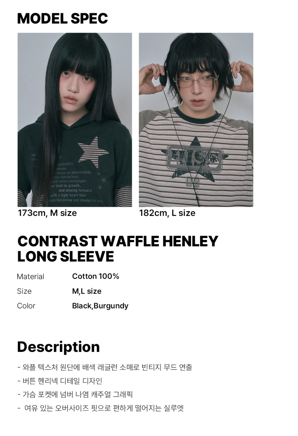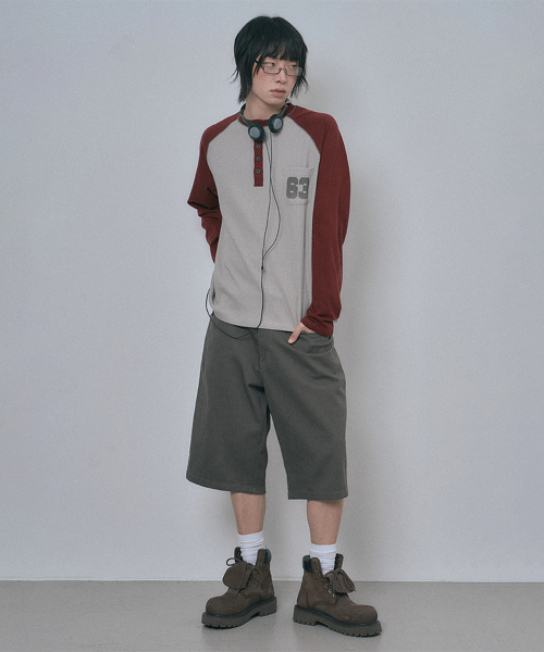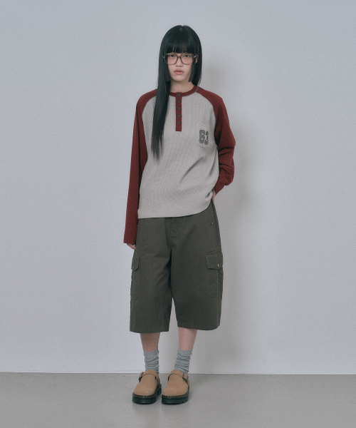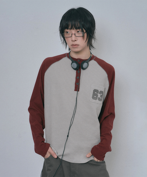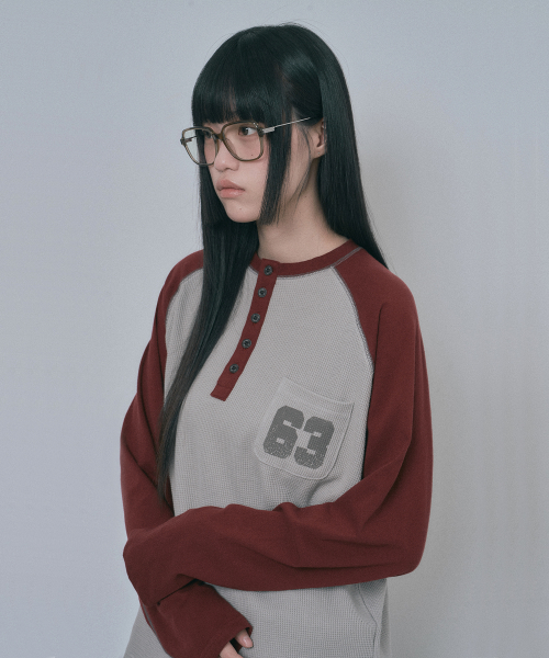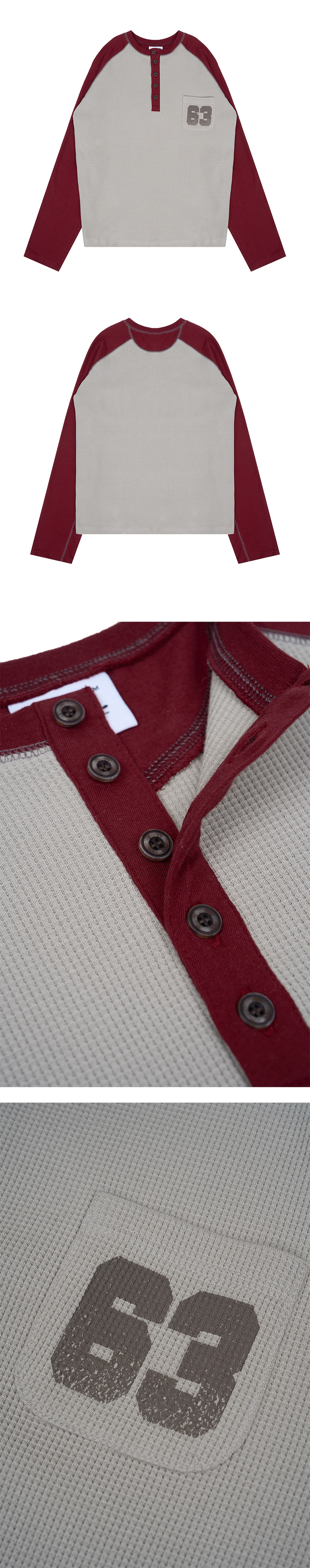 배색 와플 헨리넥 롱슬리브 - 버건디