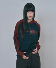 배색 라인 스트라이프 후드 롱슬리브 - 버건디