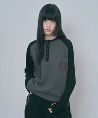 배색 와플 헨리넥 롱슬리브 - 블랙