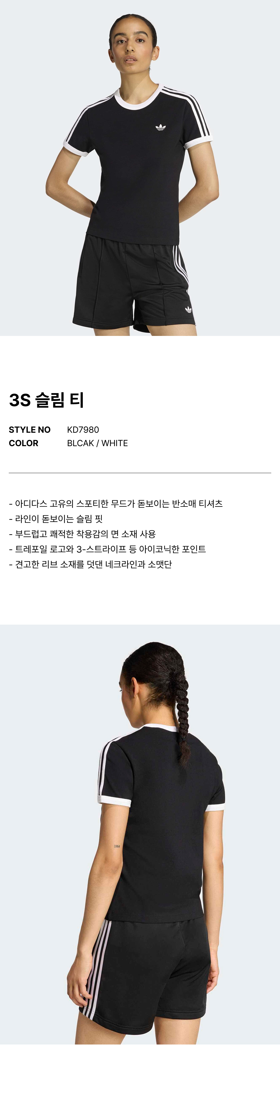 3-스트라이프 슬림 티셔츠 - 블랙:화이트 / KD7980