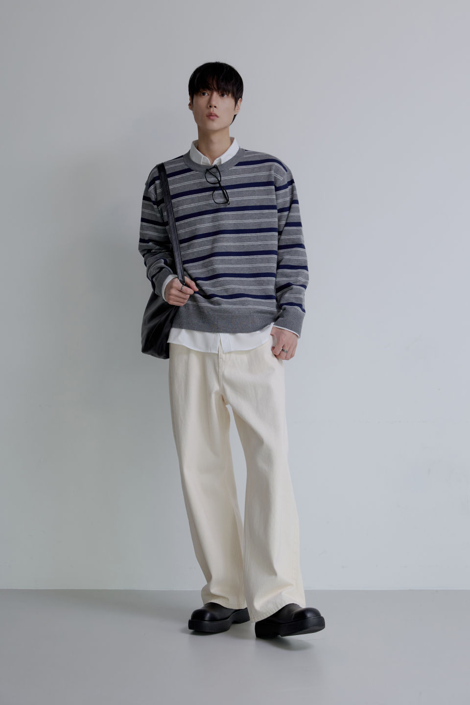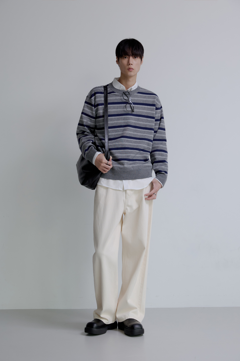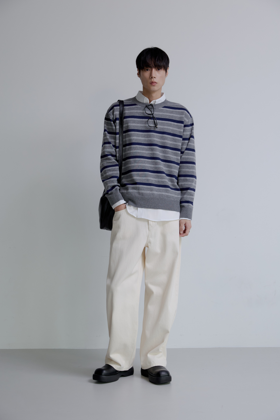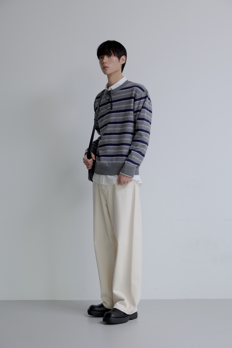 트리플 스트라이프 세미 크롭 니트 [그레이]
