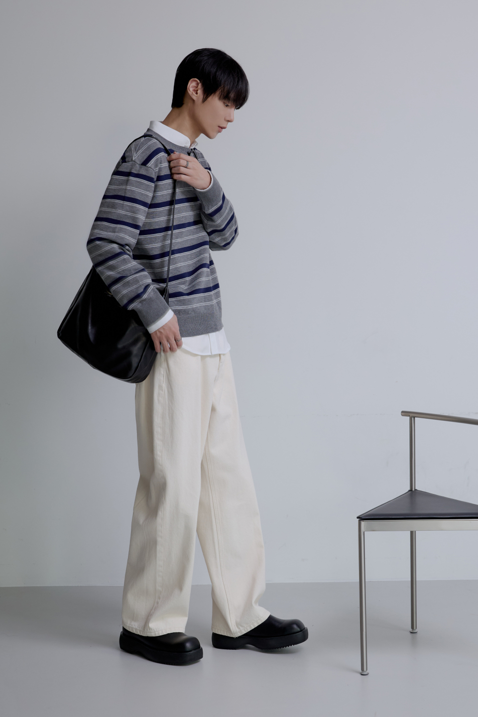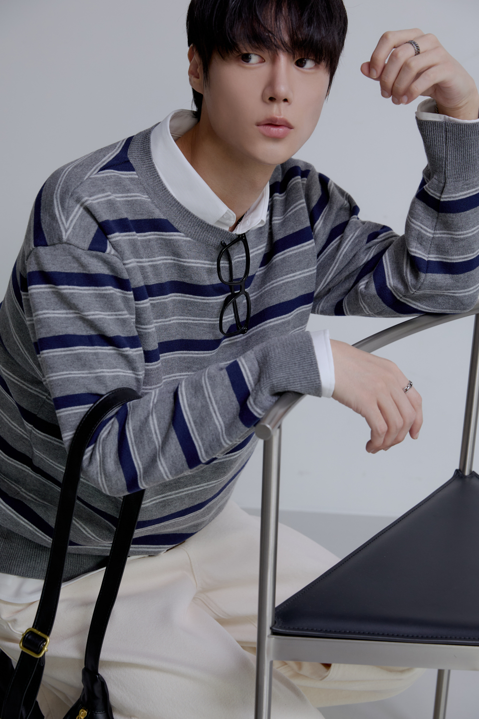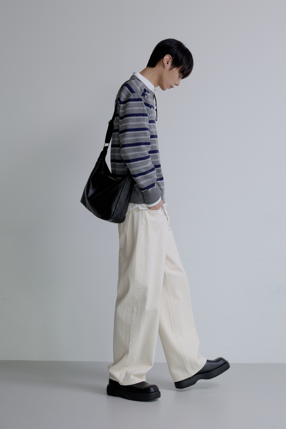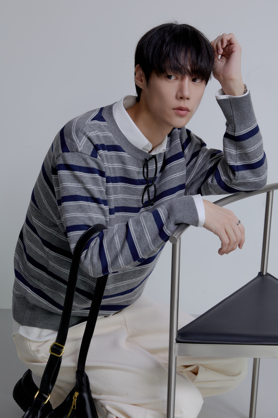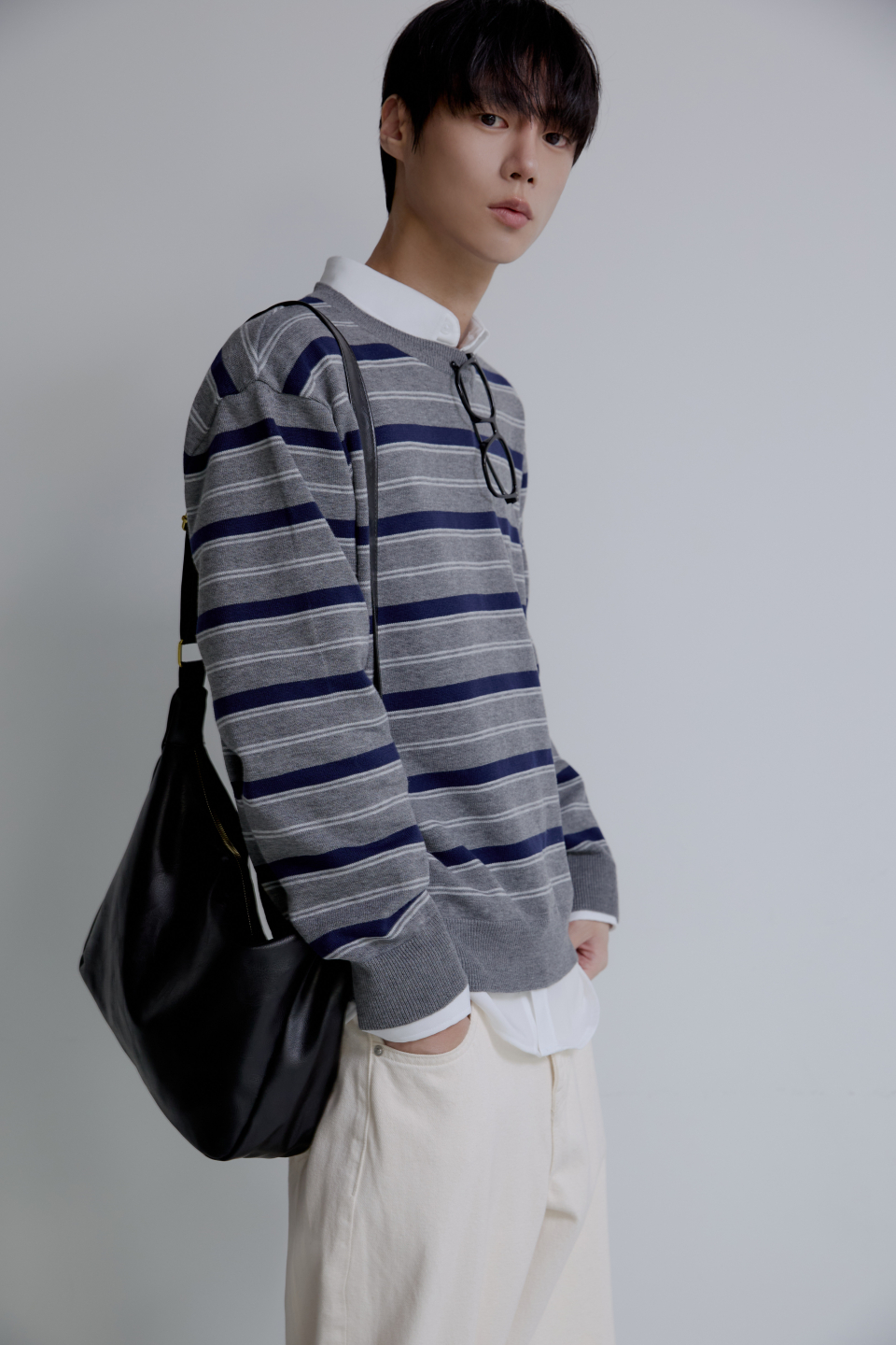 트리플 스트라이프 세미 크롭 니트 [그레이]