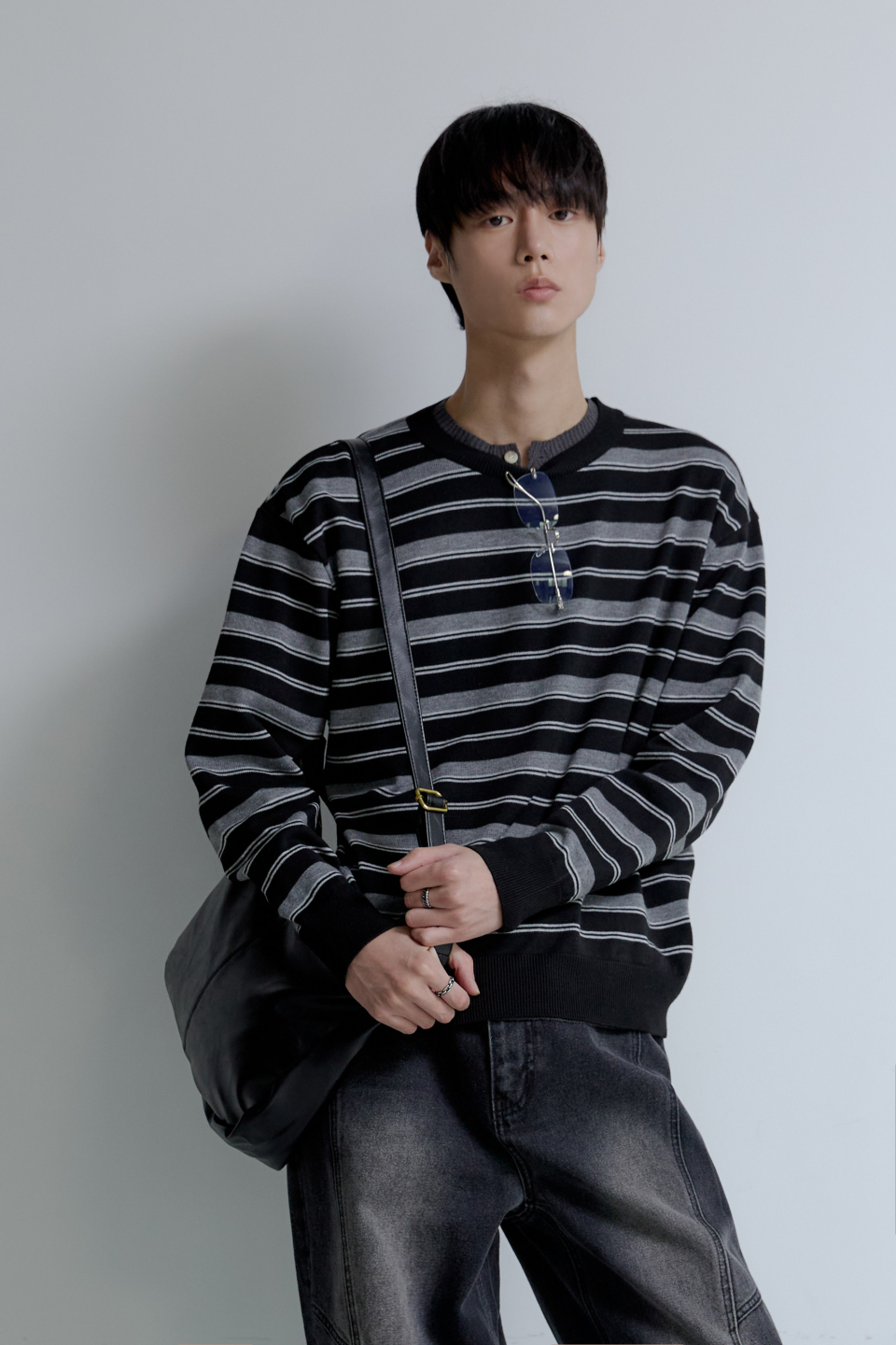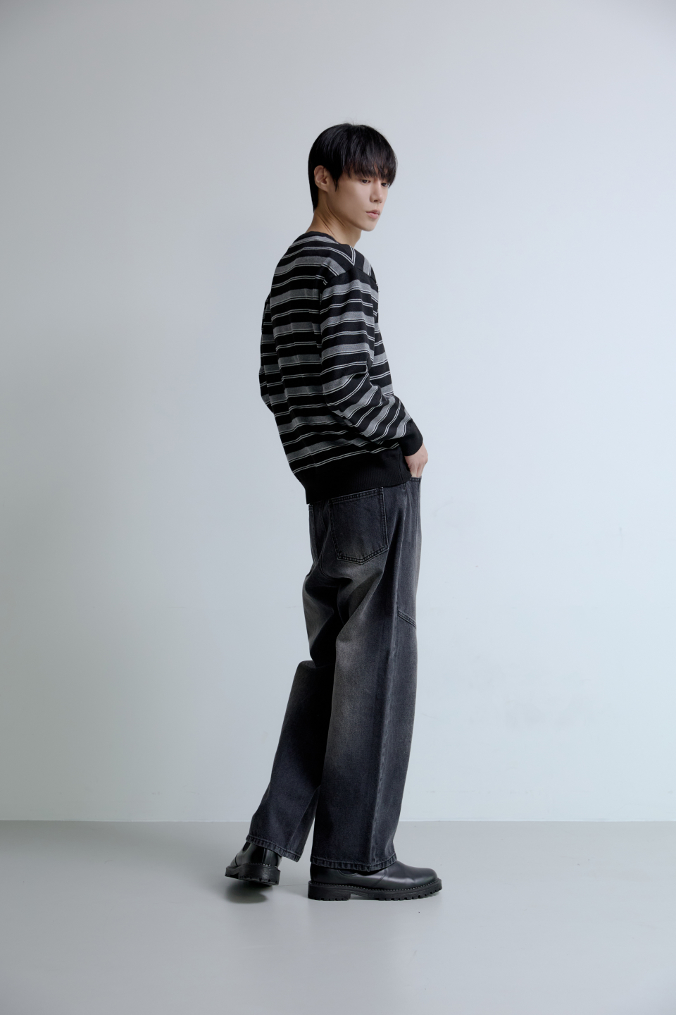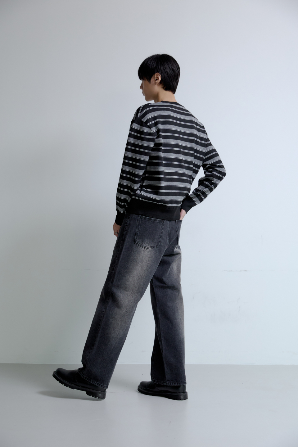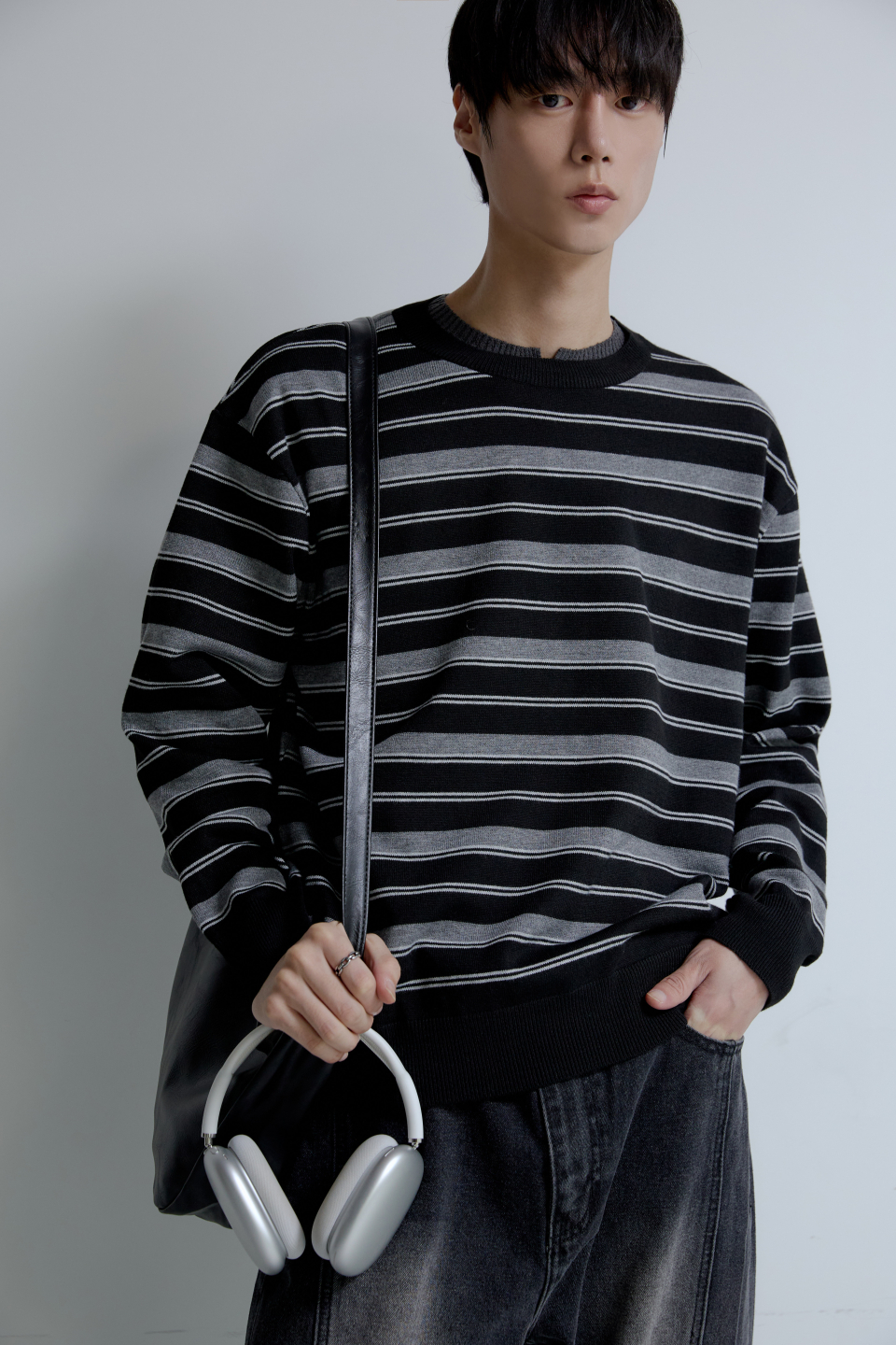 트리플 스트라이프 세미 크롭 니트 [블랙]
