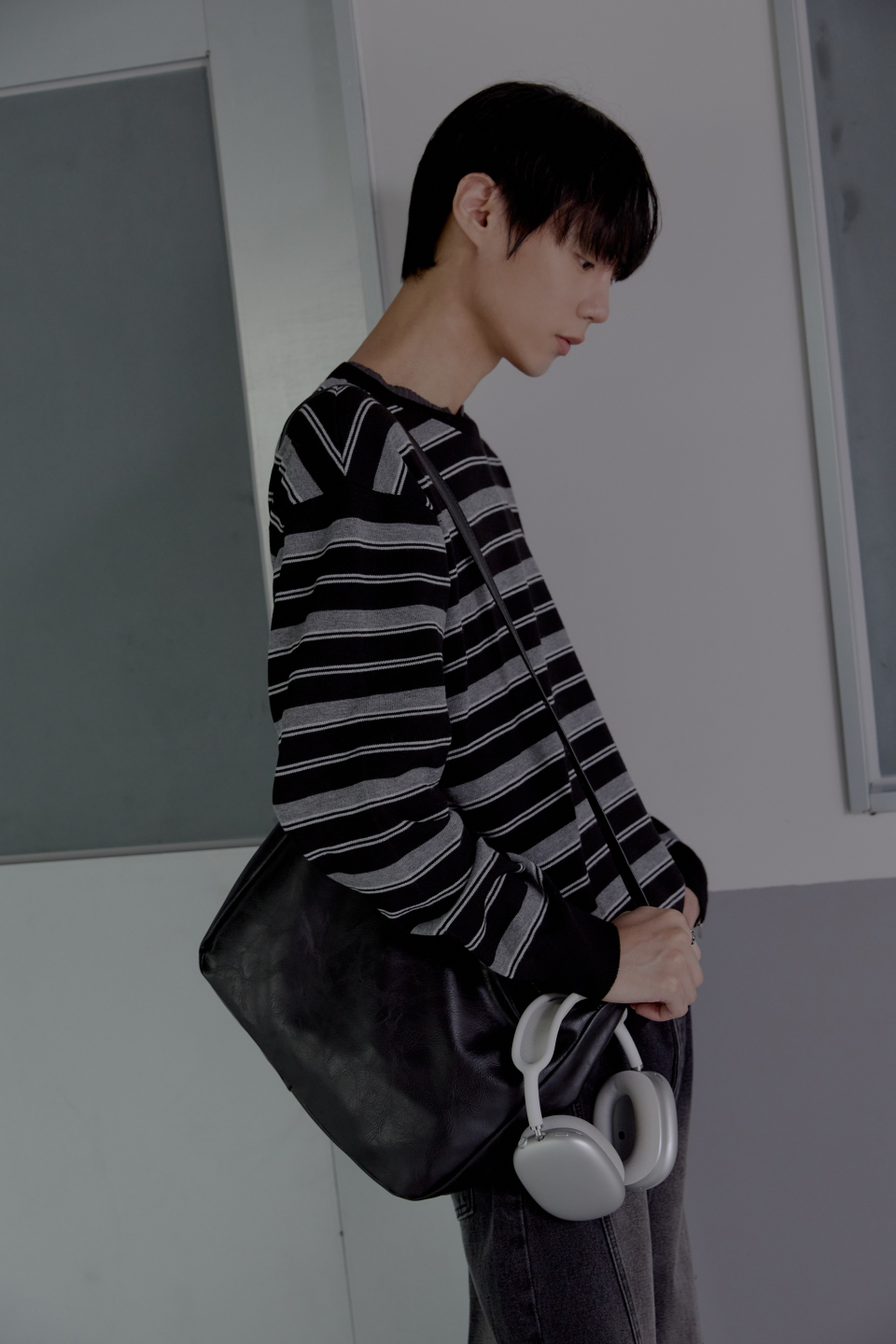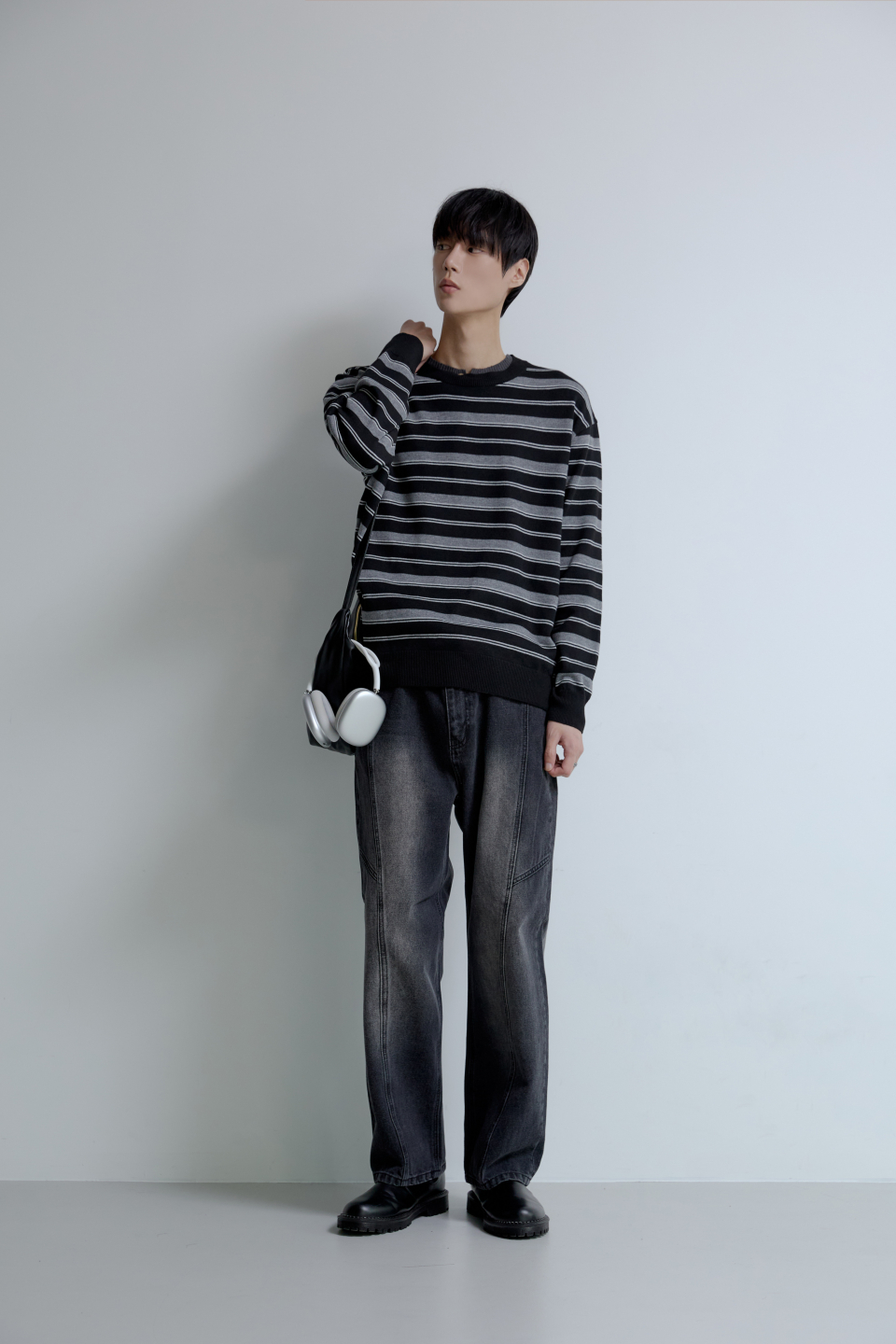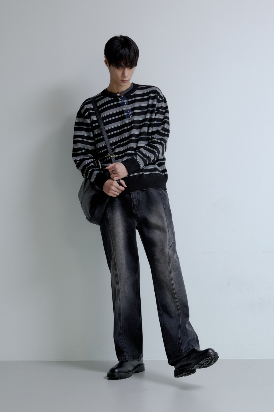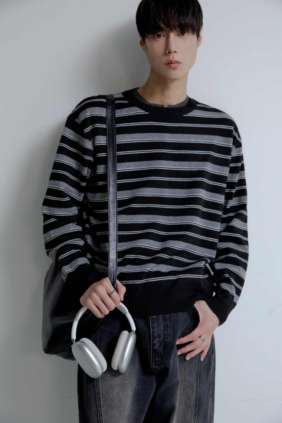 트리플 스트라이프 세미 크롭 니트 [블랙]