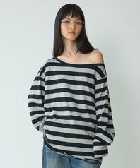 원 숄더 디스트레스드 티셔츠 [스트라이프 블랙]