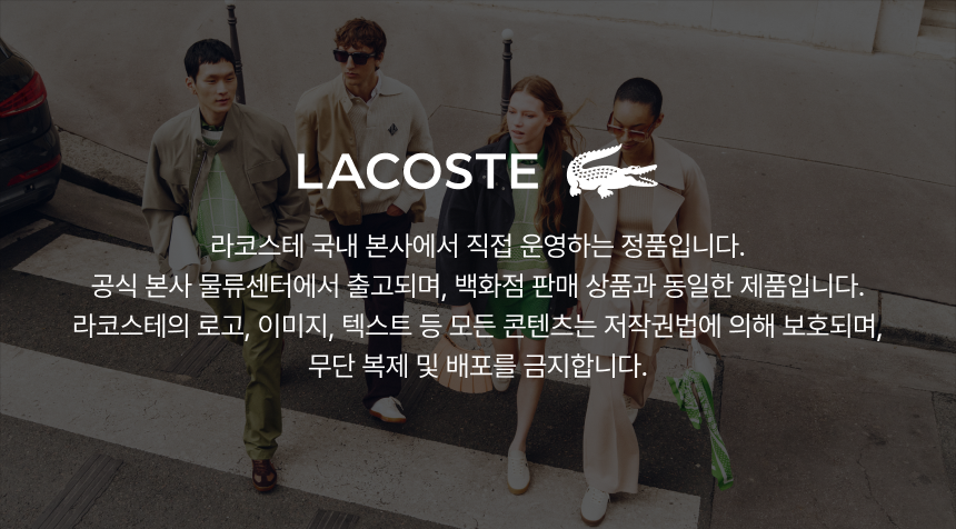 LACOSTE(라코스테)는 1920년대 프랑스의 테니스 스타인 장 르네 라코스테(Jean Rene Lacoste)에 의해 만들어진 브랜드입니다. 라코스테가 편안한 운동복을 위해 자신이 입을 선수복 PK 티셔츠를 최초로 만든 것을 시작으로 티셔츠 뿐만 아니라 블레이저 등 다양한 제품군으로 제작을 확장하였습니다. 라코스테의 상징인 악어캐릭터는 라코스테 자신의 별명이었던 `악어`에서 유래하여 탄생되었습니다.